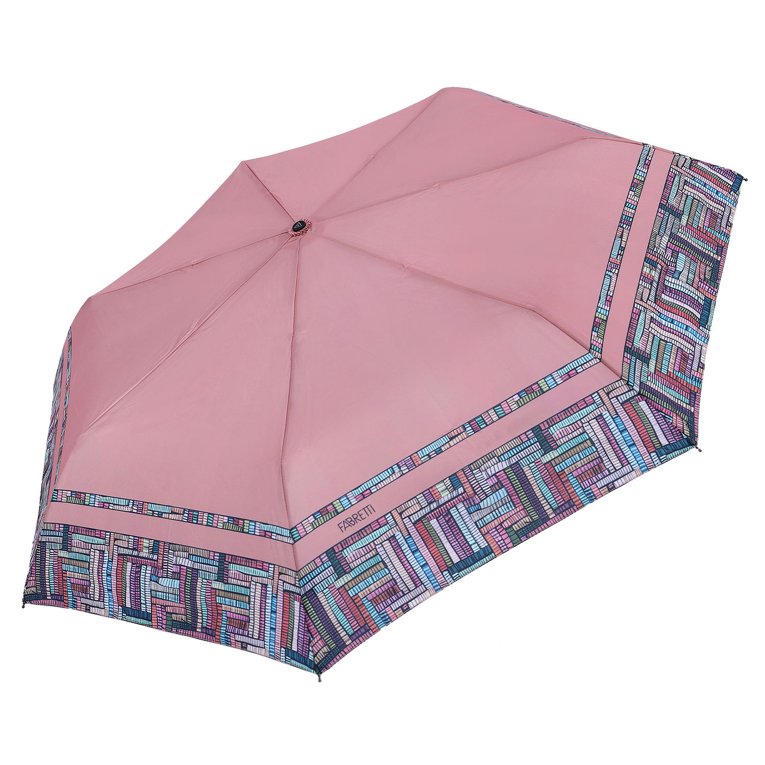 Компактный зонт-мини FABRETTI легко поместится в женскую сумку и всегда будет под рукой в нужный момент. Купол в розовом оттенке выполнен из полиэстера с плетением нити - эпонж. Такое плетение помимо матовой фактуры придает ткани высокую прочность и устойчивость к выцветанию. В качестве декора выбран оригинальный кант с геометрическим принтом.