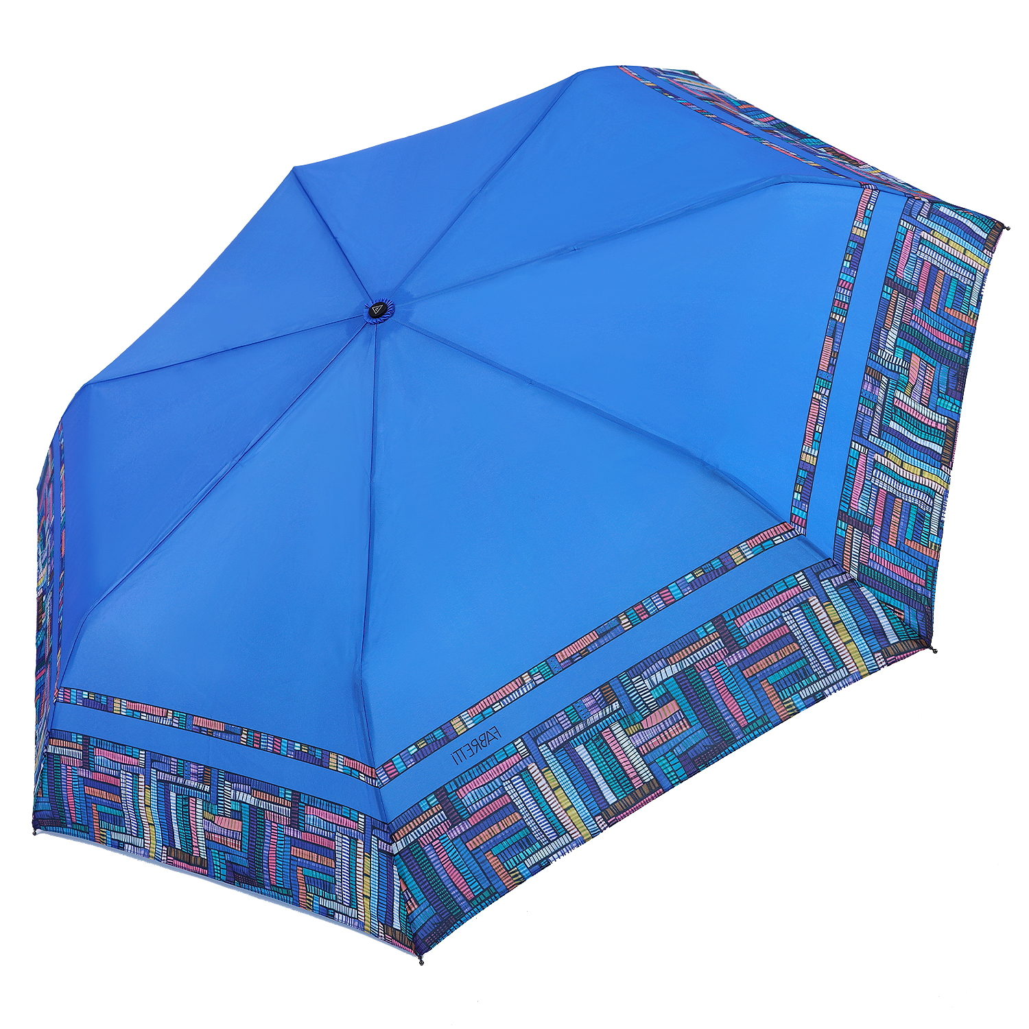 Компактный зонт-мини FABRETTI легко поместится в женскую сумку и всегда будет под рукой в нужный момент. Купол в синем оттенке выполнен из полиэстера с плетением нити - эпонж. Такое плетение помимо матовой фактуры придает ткани высокую прочность и устойчивость к выцветанию. В качестве декора выбран оригинальный кант с геометрическим принтом.