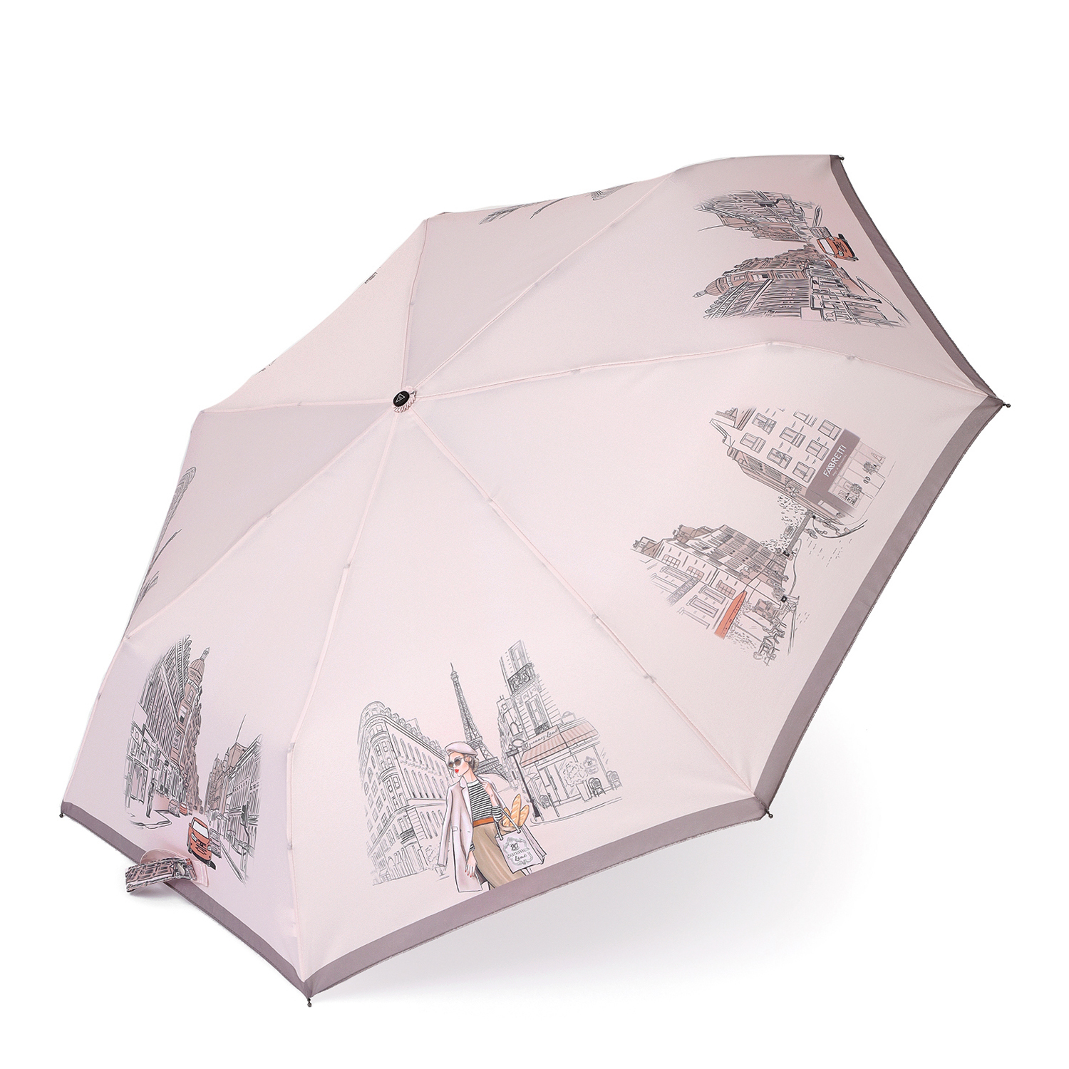 Компактный мини-зонт итальянского бренда FABRETTI легко поместится в сумку и всегда будет под рукой в нужный момент. Купол светлого розово-бежевого оттенка украшен романтичным принтом с парижскими улочками, ярким акцентом темно-бежевый кант по краю. Купол выполнен из материала с матовой фактурой эпонж. Она придает ткани высокую прочность и устойчивость к выцветанию.