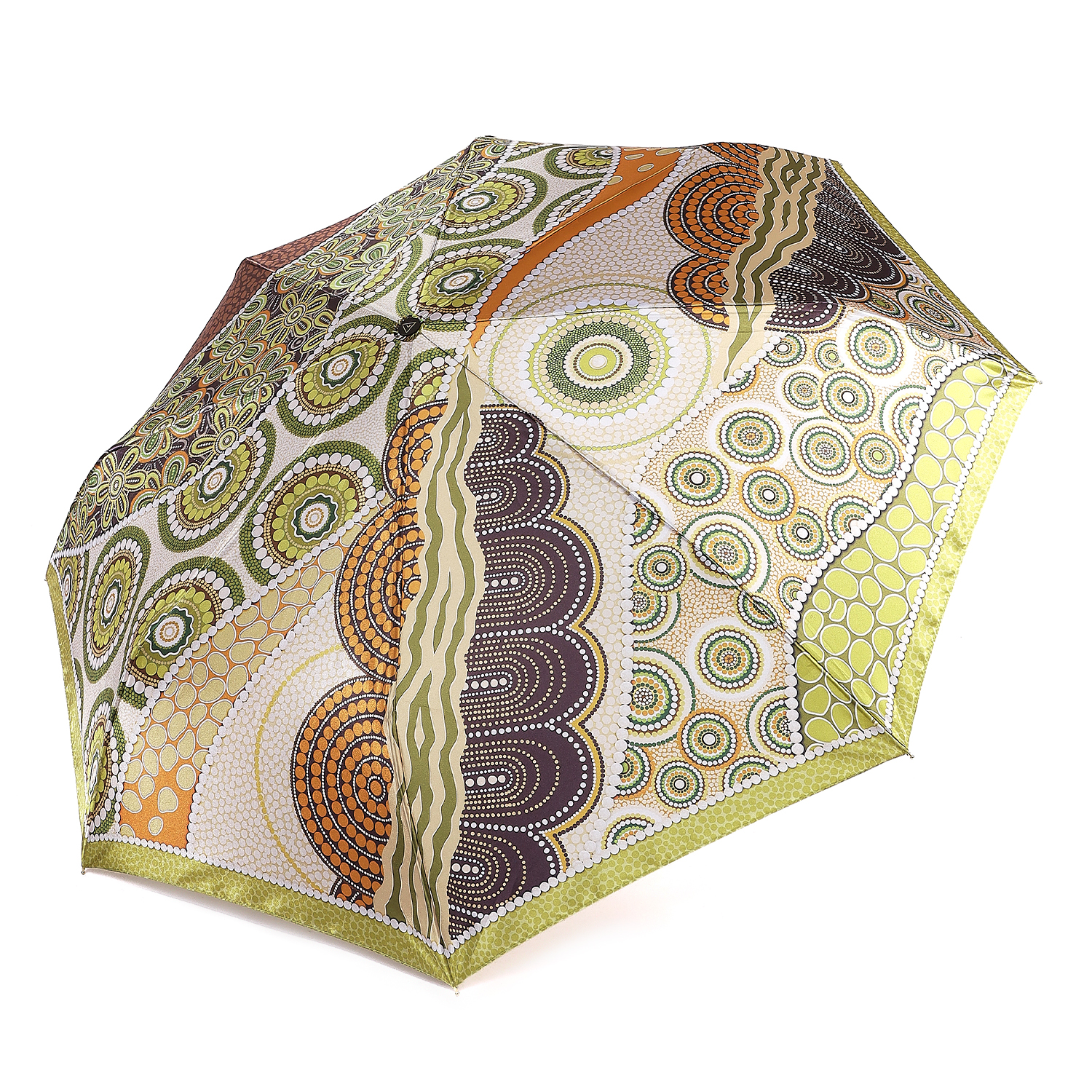 Зонт-автомат тройного сложения итальянского бренда FABRETTI  с интересным абстрактным узором, сложенным из горошин разного размера, цвета и формы в натуральных зеленых, медно-коричневых и бежевых тонах. Купол выполнен из гладкого искусственного сатина с шелковистой фактурой и мягким блеском.