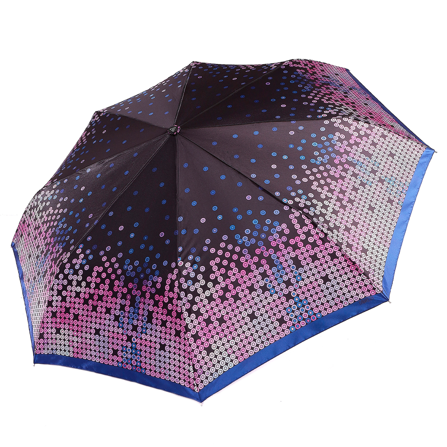 Зонт-автомат тройного сложения итальянского бренда FABRETTI украшен ярким геометрическим узором из кругов розового и фиолетового цвета на черном фоне. Купол выполнен из гладкого искусственного сатина с шелковистой фактурой и мягким блеском.