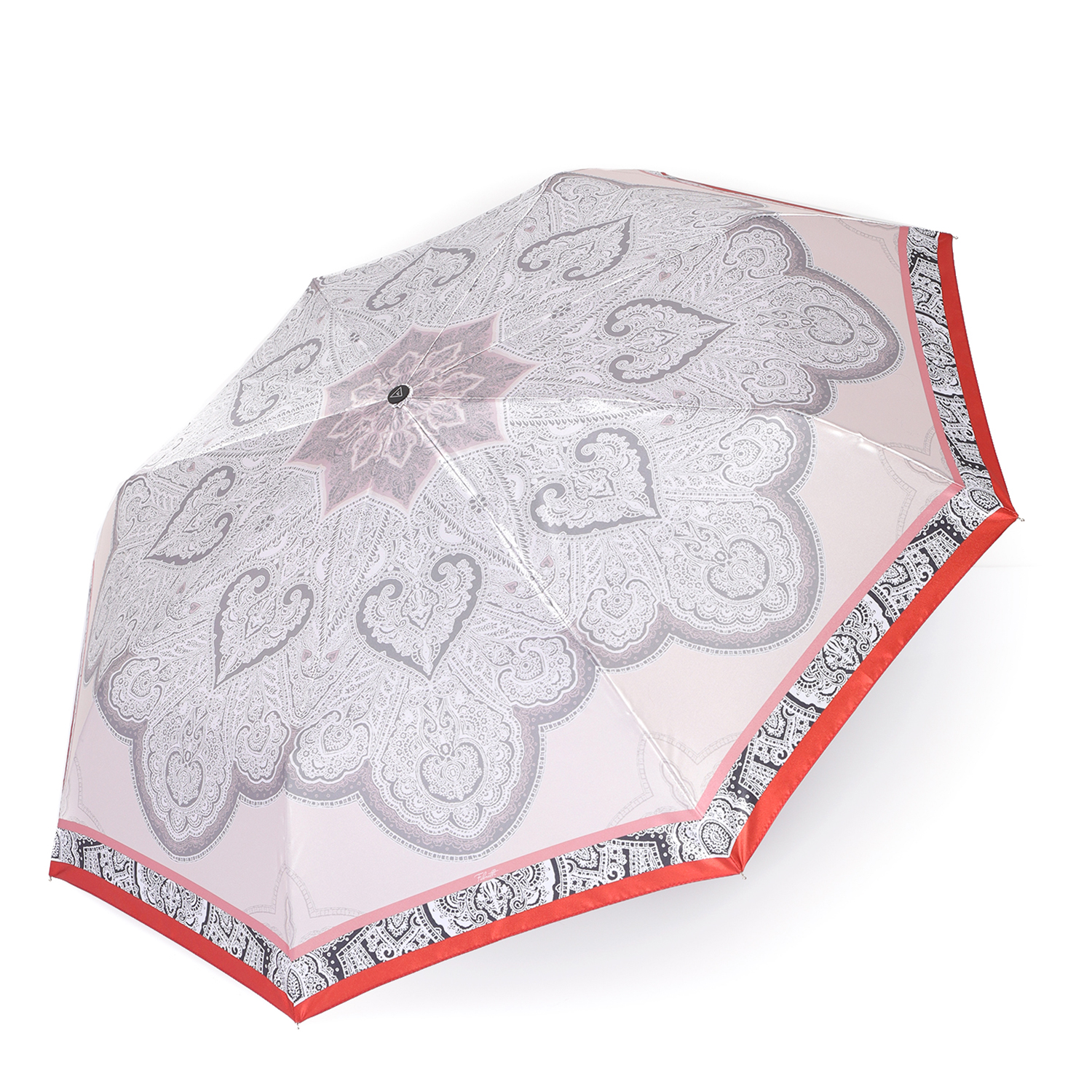 Зонт-автомат тройного сложения итальянского бренда FABRETTI в бежево-розовом цвете украшен романтичным кружевным восточным узором с пейсли и другими орнаментами, цветовым акцентом выступает ярко-красная полоса по краю куполу. Купол выполнен из гладкого искусственного сатина с шелковистой фактурой и мягким блеском.