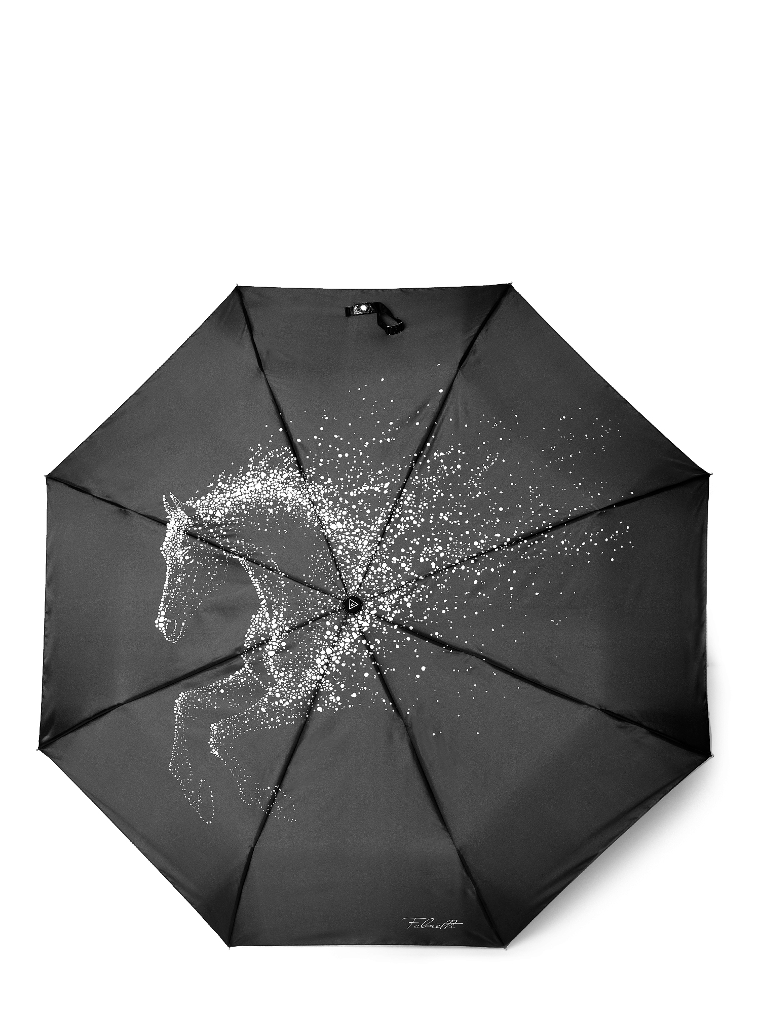 Зонт-автомат тройного сложения итальянского бренда FABRETTI украшен романтичным принтом в виде звездной лошади, бегущей по черному ночному небу. Купол выполнен из гладкого искусственного сатина с шелковистой фактурой и мягким блеском.