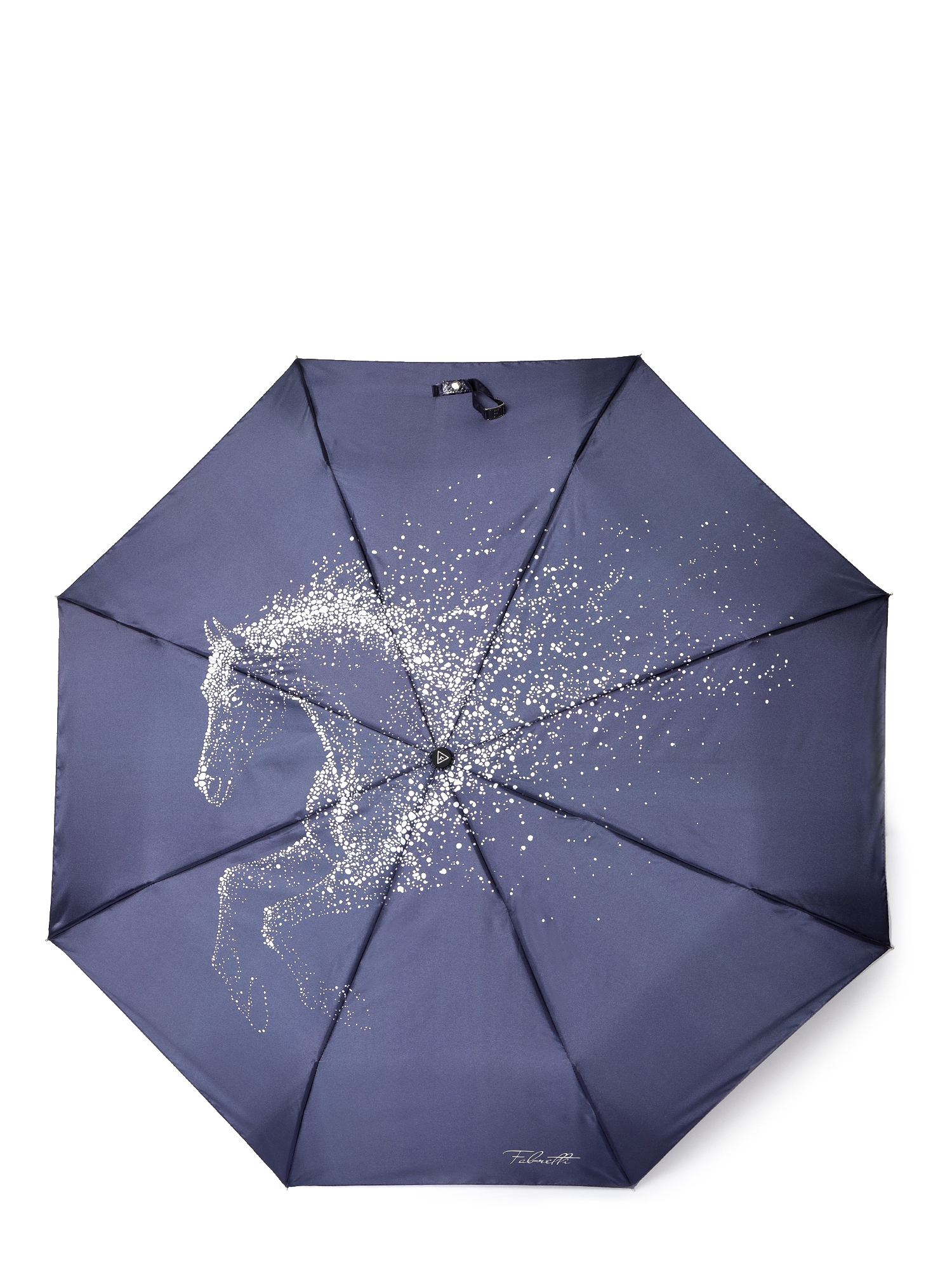 Зонт-автомат тройного сложения итальянского бренда FABRETTI украшен романтичным принтом в виде звездной лошади, бегущей по темно-синему ночному небу. Купол выполнен из гладкого искусственного сатина с шелковистой фактурой и мягким блеском.
