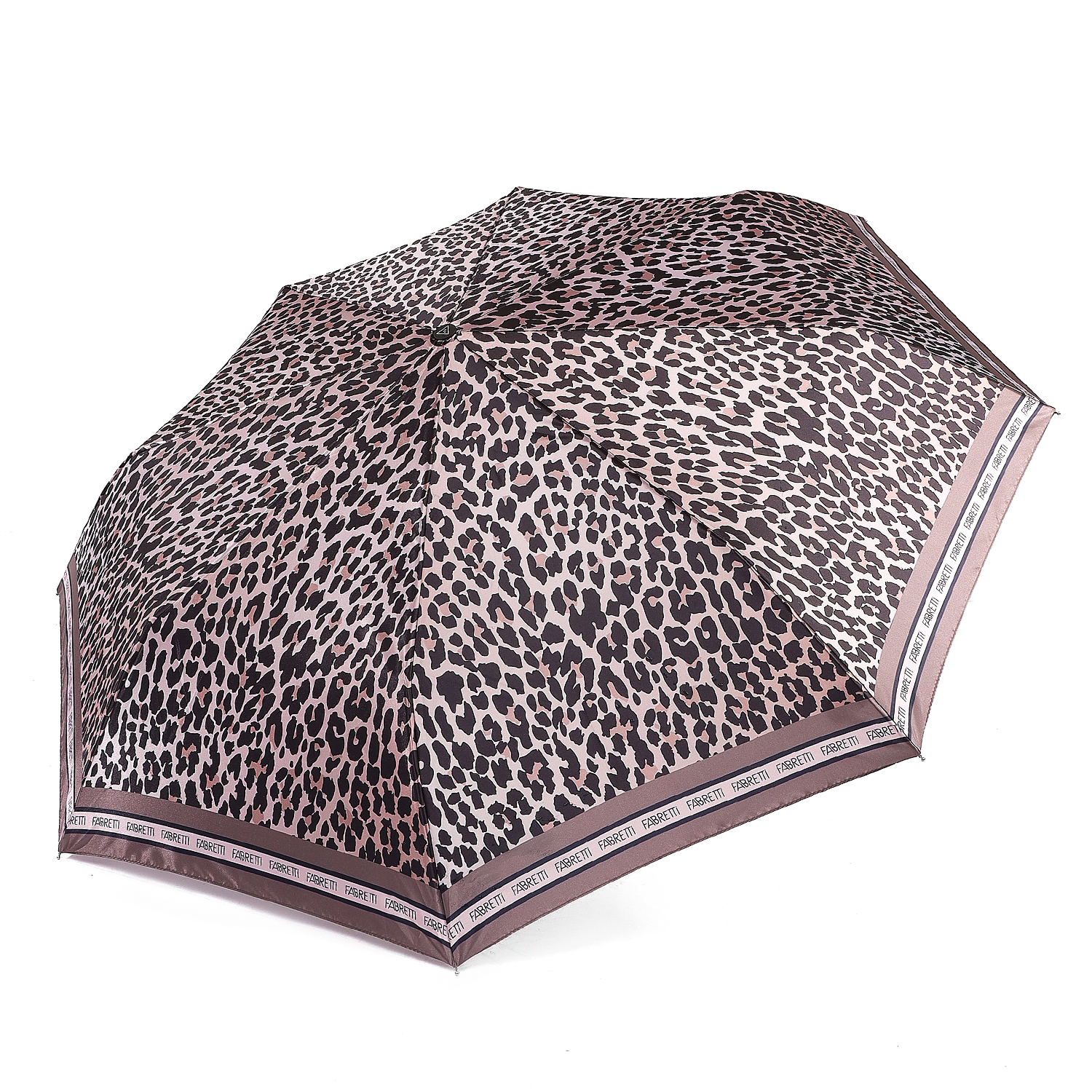 Зонт-автомат тройного сложения итальянского бренда FABRETTI украшен дерзким леопардовым принтом, сочетающим нежно-розовый, серо-коричневый и черный цвета. Купол выполнен из гладкого искусственного сатина с шелковистой фактурой и мягким блеском.
