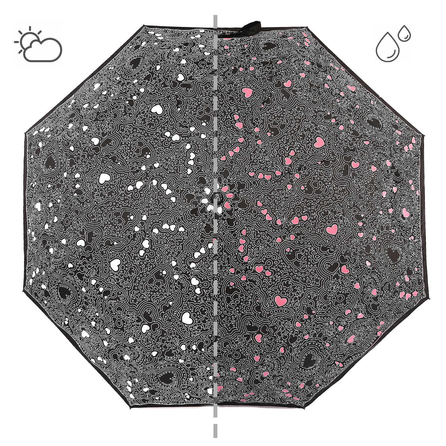 Эксклюзивный женский зонт-автомат FABRETTI с эффектом «хамелеон» не только защитит от дождя, но и поднимет настроение в непогоду. Белый рисунок на однотонном черном фоне при намокании меняет цвет – сердца становятся ярко-красными, а при высыхании - снова белыми.