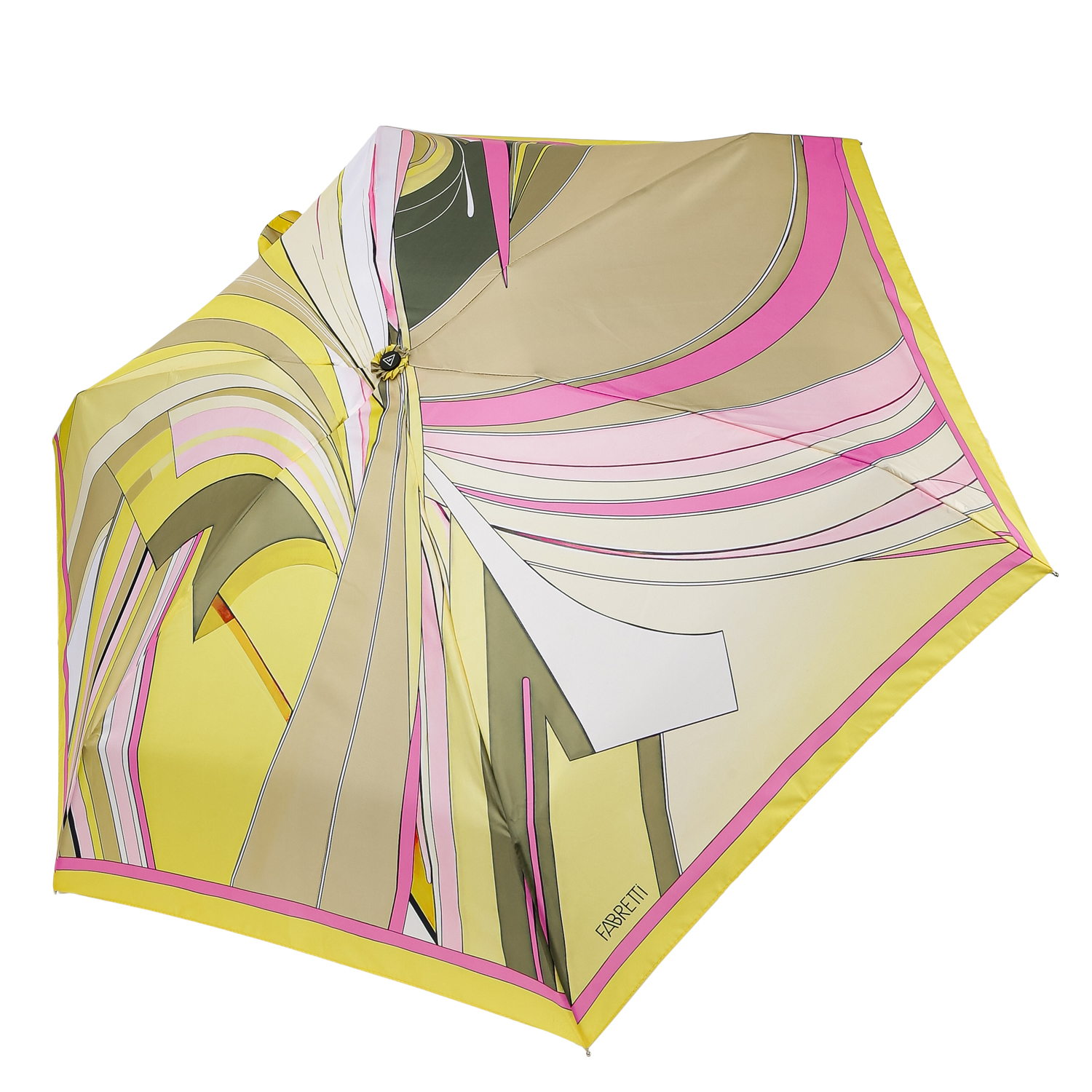 Компактный механический зонт FABRETTI в 5 сложениях легко поместится в женскую сумку и всегда будет под рукой в нужный момент. Купол выполнен из полиэстера с плетением нити - эпонж. Такое плетение помимо матовой фактуры придает ткани высокую прочность и устойчивость к выцветанию. В качестве декора выбран абстрактный принт. Облегченная конструкция зонта изготовлена из алюминия. Аксессуар оснащен удобной нескользящей ручкой с петлей. Открывается и закрывается механическим способом.