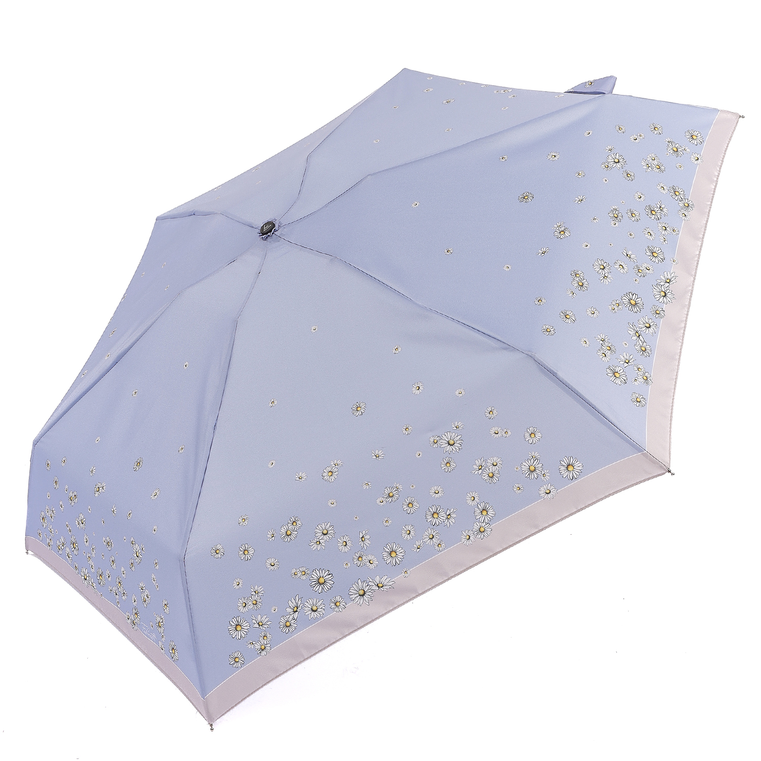 Компактный механический зонт-мини итальянского бренда FABRETTI в 5 сложениях легко поместится в женскую сумку и всегда будет под рукой в нужный момент. Купол в нежном светло-сиреневом оттенке украшен узором из мелких цветов ромашек с однотонным кантом по краю; выполнен из материала с матовой фактурой эпонж. Она придает ткани высокую прочность и устойчивость к выцветанию.