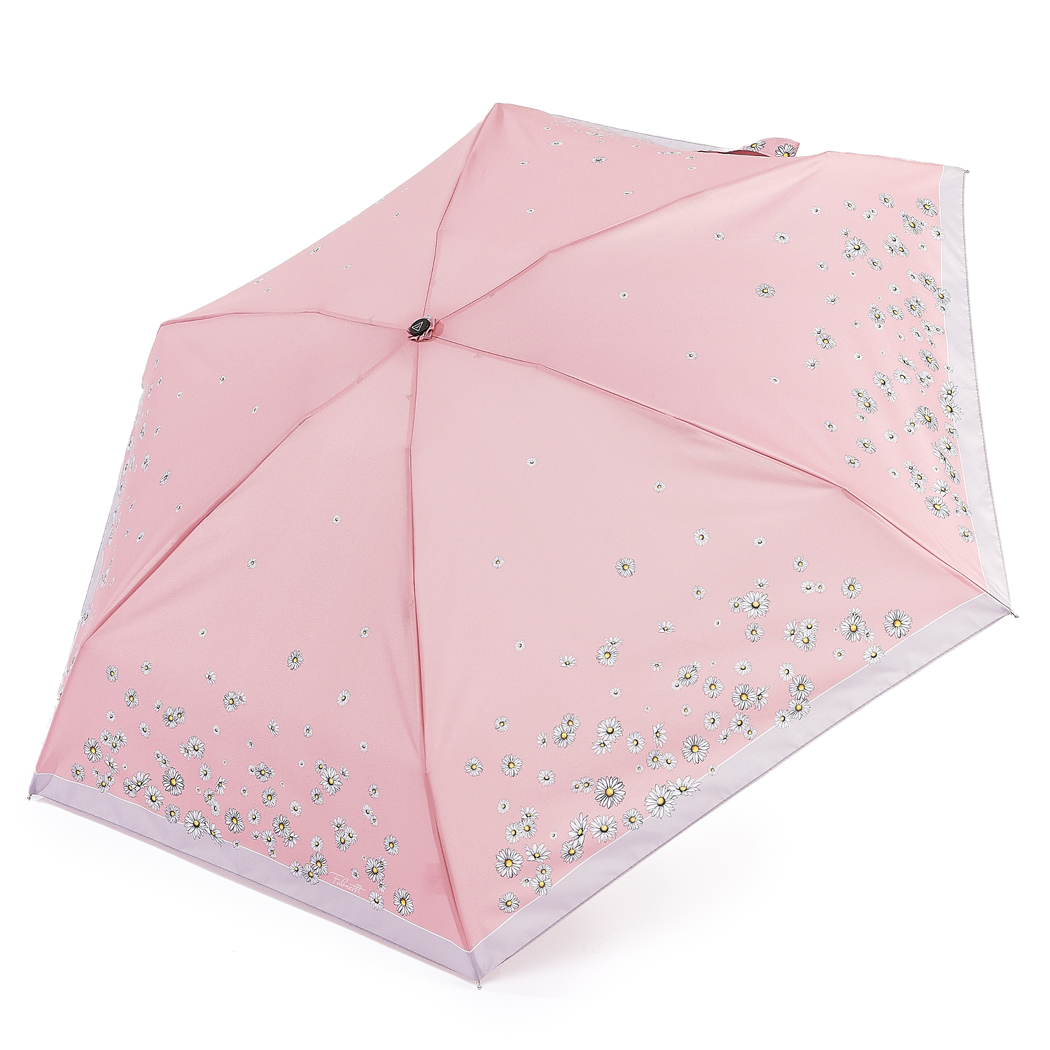 Компактный механический зонт-мини итальянского бренда FABRETTI в 5 сложениях легко поместится в женскую сумку и всегда будет под рукой в нужный момент. Купол в нежном розовом оттенке украшен узором из мелких цветов ромашек с однотонным кантом по краю; выполнен из материала с матовой фактурой эпонж. Она придает ткани высокую прочность и устойчивость к выцветанию.