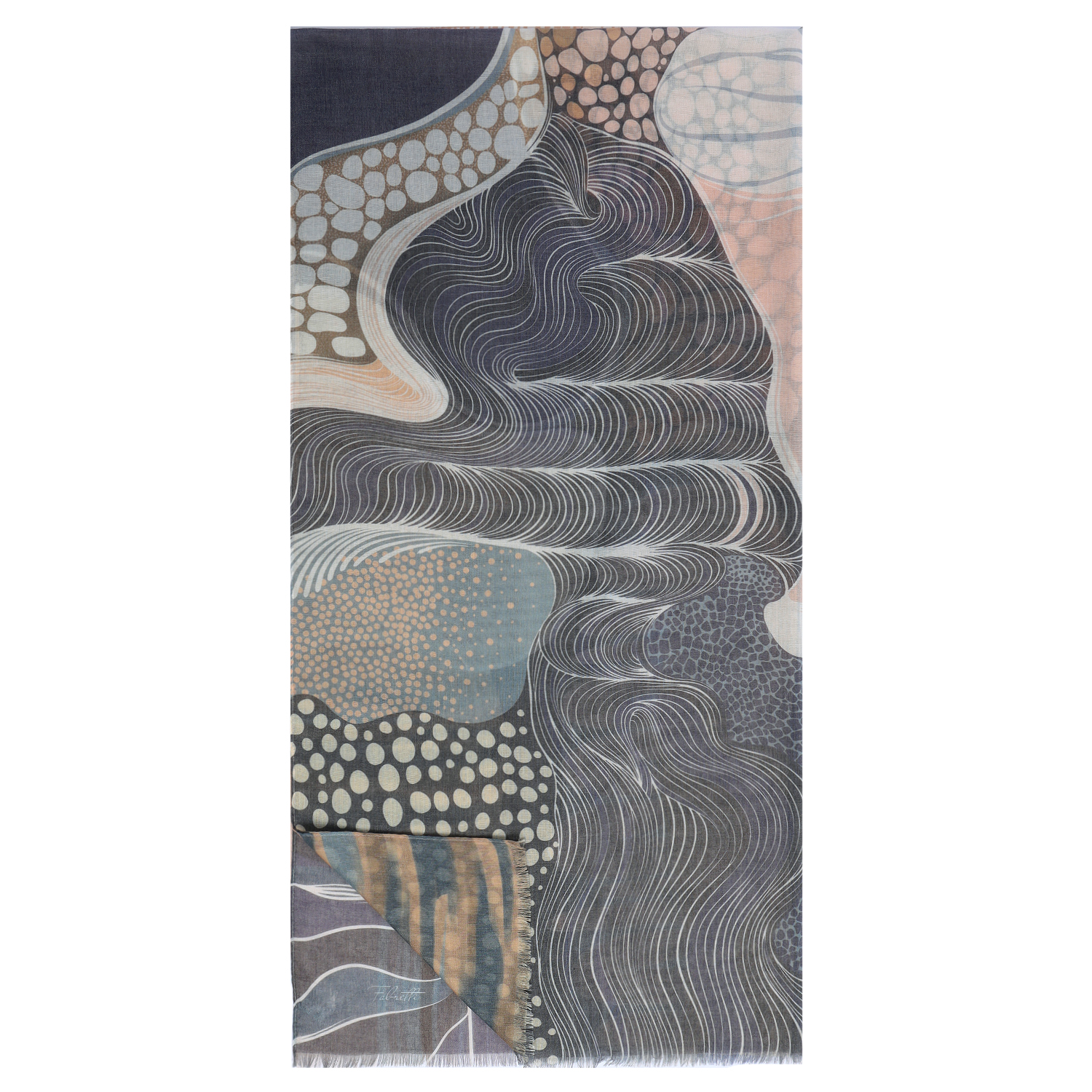Легкий женский шарф итальянского бренда FABRETTI с невероятным узором из волн, линий, гороха и камней в природных серых и бежевых тонах идеально подходит для теплого сезона.
