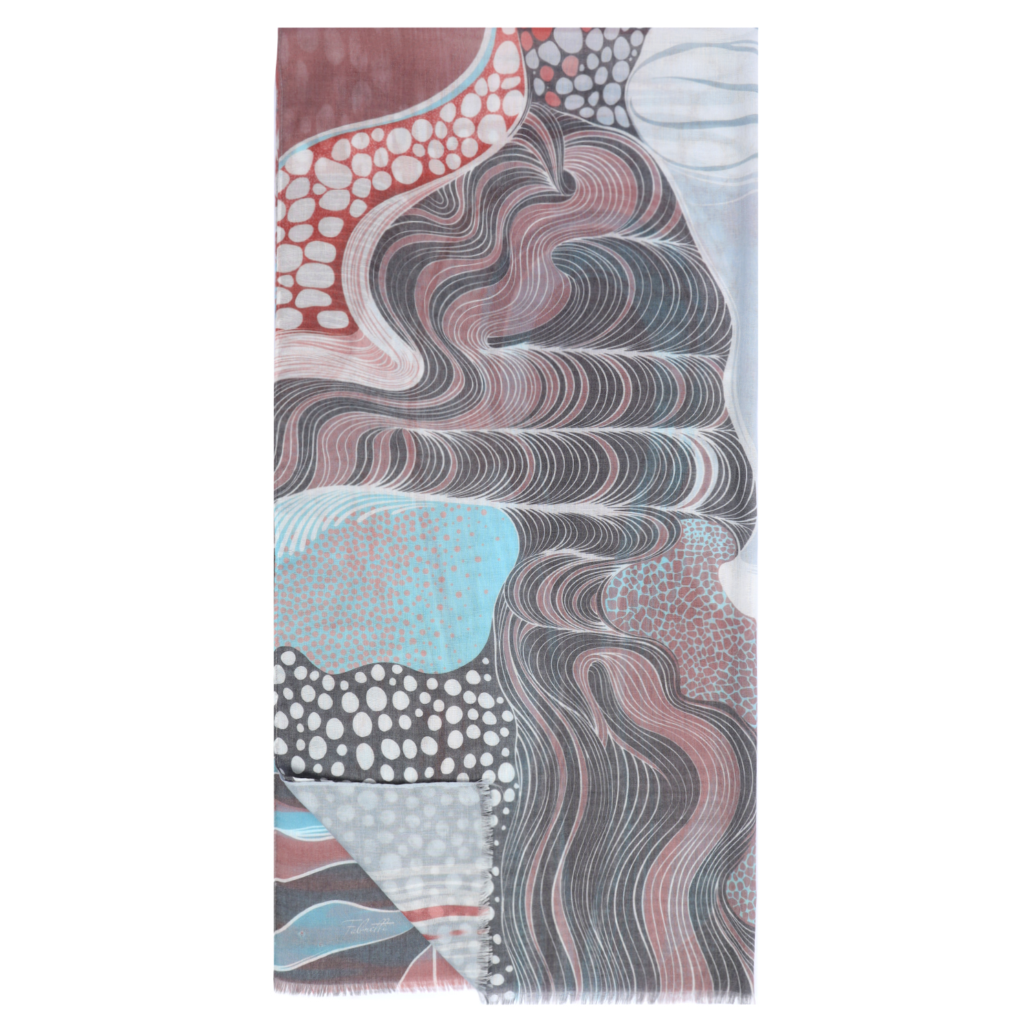 Легкий женский шарф итальянского бренда FABRETTI с невероятным узором из волн, линий, гороха и камней в природных красных и бежевых тонах идеально подходит для теплого сезона.
