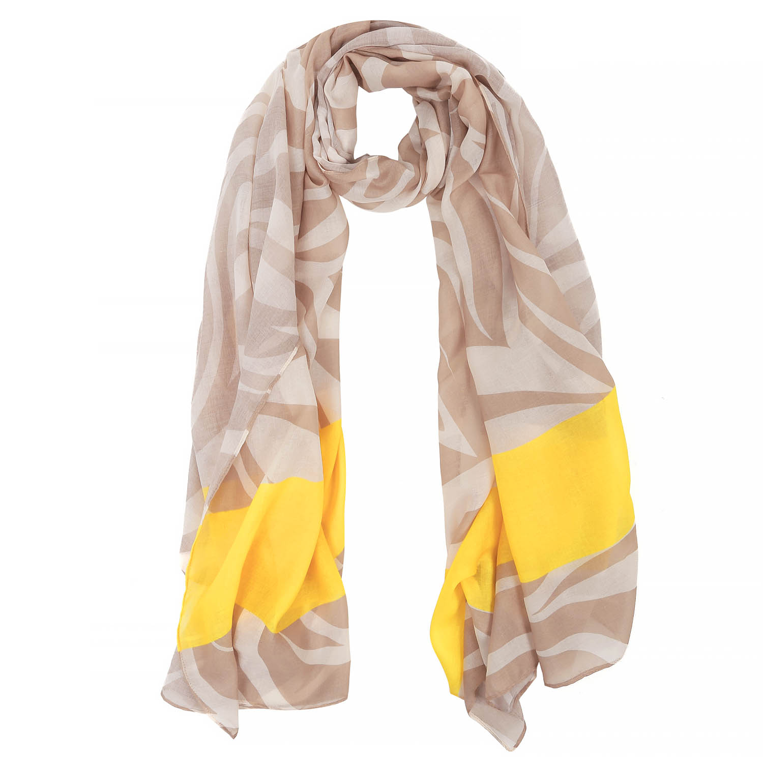 Бежевый фон шарфа Fabretti создает атмосферу спокойствия и гармонии, а желтые полосы, словно лучи солнца, привносят в дизайн динамику и яркость. Этот шарф – это идеальное сочетание лаконичности и выразительности. Он станет стильным дополнением к вашему образу, подчеркивая ваш утонченный вкус и индивидуальность. Легкий и струящийся материал подарит вам ощущение комфорта и нежности. Шарф изготовлен из 100% полиэстера. Размеры 90х172 см, вес 80 г.