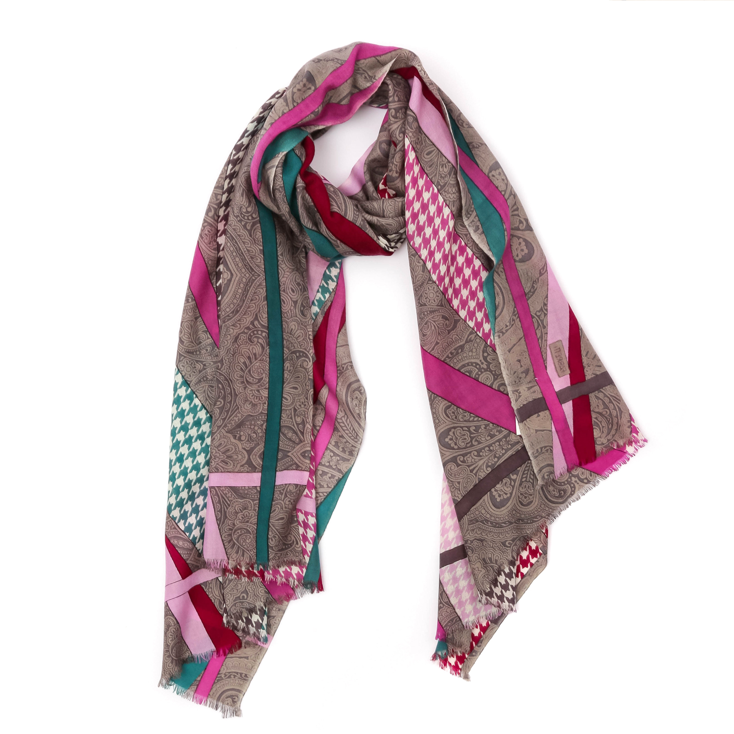 Женский шарф FABRETTI в фиолетовой гамме обладает приятной фактурой и декорирован узором в стиле пэчворк, сочетающим «гусиную лапку» и «пейсли». Аксессуар выполнен из мерсеризованной шерсти. Благодаря специальной обработке натуральная шерсть становится мягкой, шелковистой и приобретает восхитительный блеск. Изделие почти не мнется, не пилингуется и не блекнет, поэтому надолго сохранит первоначальный вид. Края украшены мелкими ресничками. Размер 70*180 см.