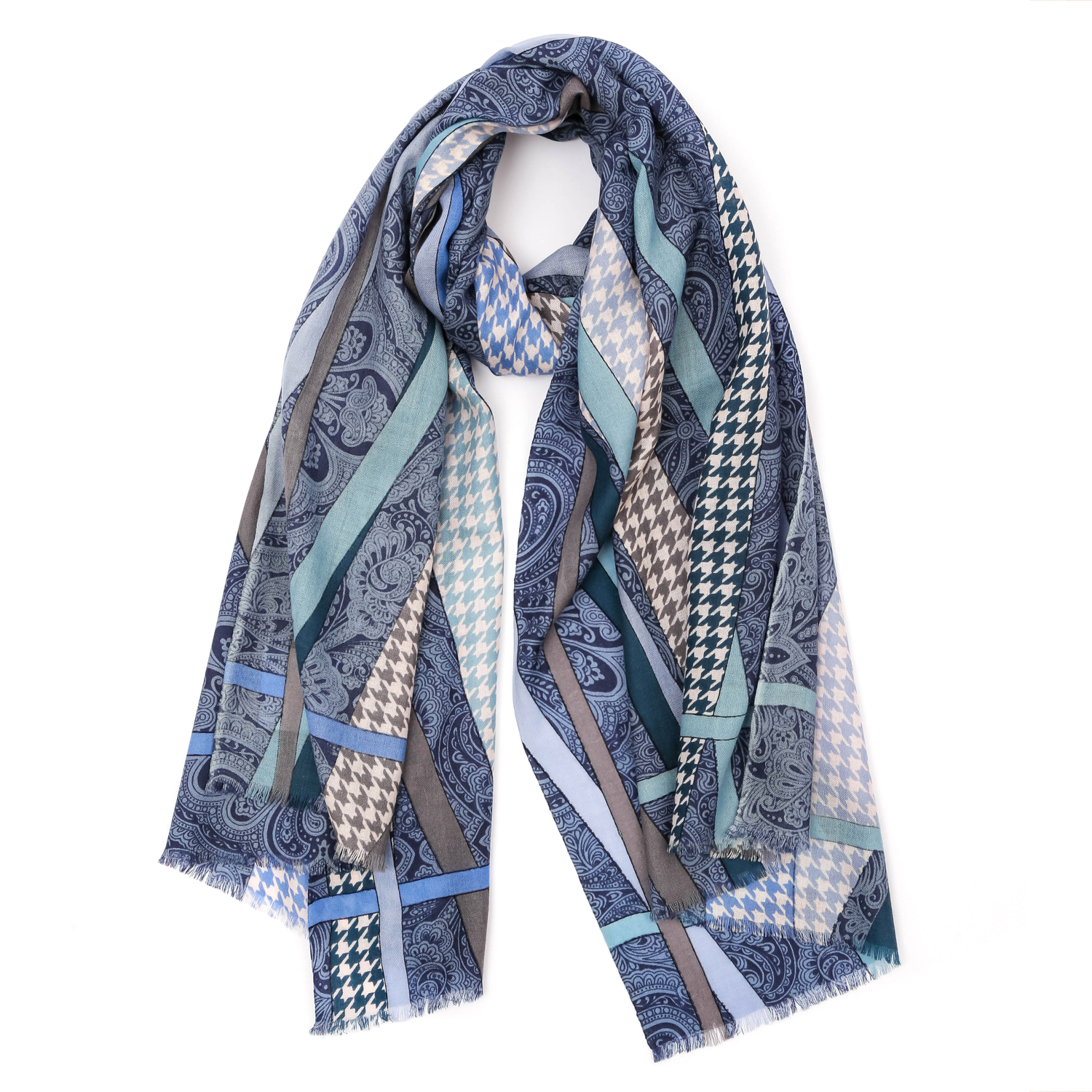 Женский шарф FABRETTI в сине-голубых тонах обладает приятной фактурой и декорирован узором в стиле пэчворк, сочетающим «гусиную лапку» и «пейсли». Аксессуар выполнен из мерсеризованной шерсти. Благодаря специальной обработке натуральная шерсть становится мягкой, шелковистой и приобретает восхитительный блеск. Изделие почти не мнется, не пилингуется и не блекнет, поэтому надолго сохранит первоначальный вид. Края украшены мелкими ресничками. Размер 70*180 см.