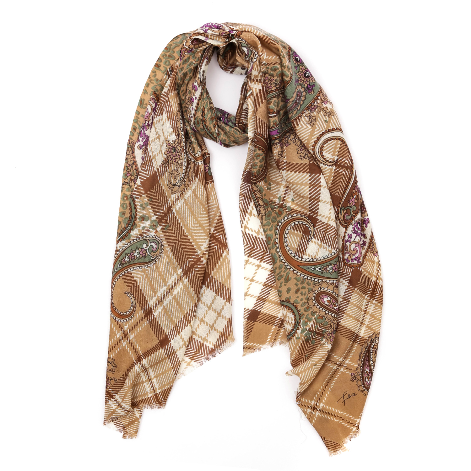 Женский шарф FABRETTI в бежевой гамме обладает приятной фактурой и декорирован узором в стиле пэчворк, сочетающим «клетку» и «пейсли». Аксессуар выполнен из мерсеризованной шерсти. Благодаря специальной обработке натуральная шерсть становится мягкой, шелковистой и приобретает восхитительный блеск. Изделие почти не мнется, не пилингуется и не блекнет, поэтому надолго сохранит первоначальный вид. Края украшены мелкими ресничками. Размер 70*180 см.