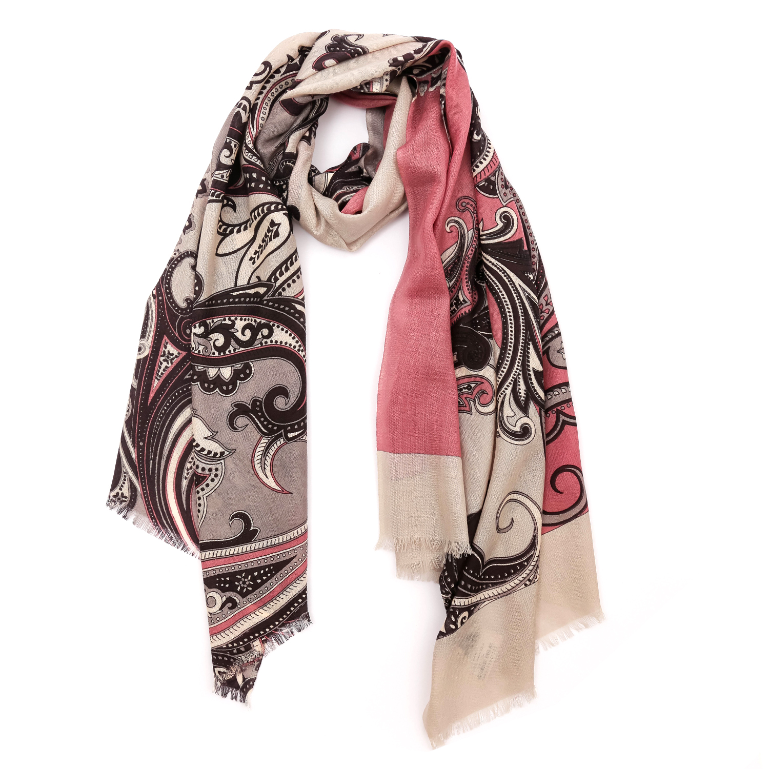 Женский шарф FABRETTI в приглушенном розовом оттенке обладает приятной фактурой и декорирован узором «пейсли». Аксессуар выполнен из мерсеризованной шерсти. Благодаря специальной обработке натуральная шерсть становится мягкой, шелковистой и приобретает восхитительный блеск. Изделие почти не мнется, не пилингуется и не блекнет, поэтому надолго сохранит первоначальный вид. Края украшены мелкими ресничками. Размер 70*180 см.