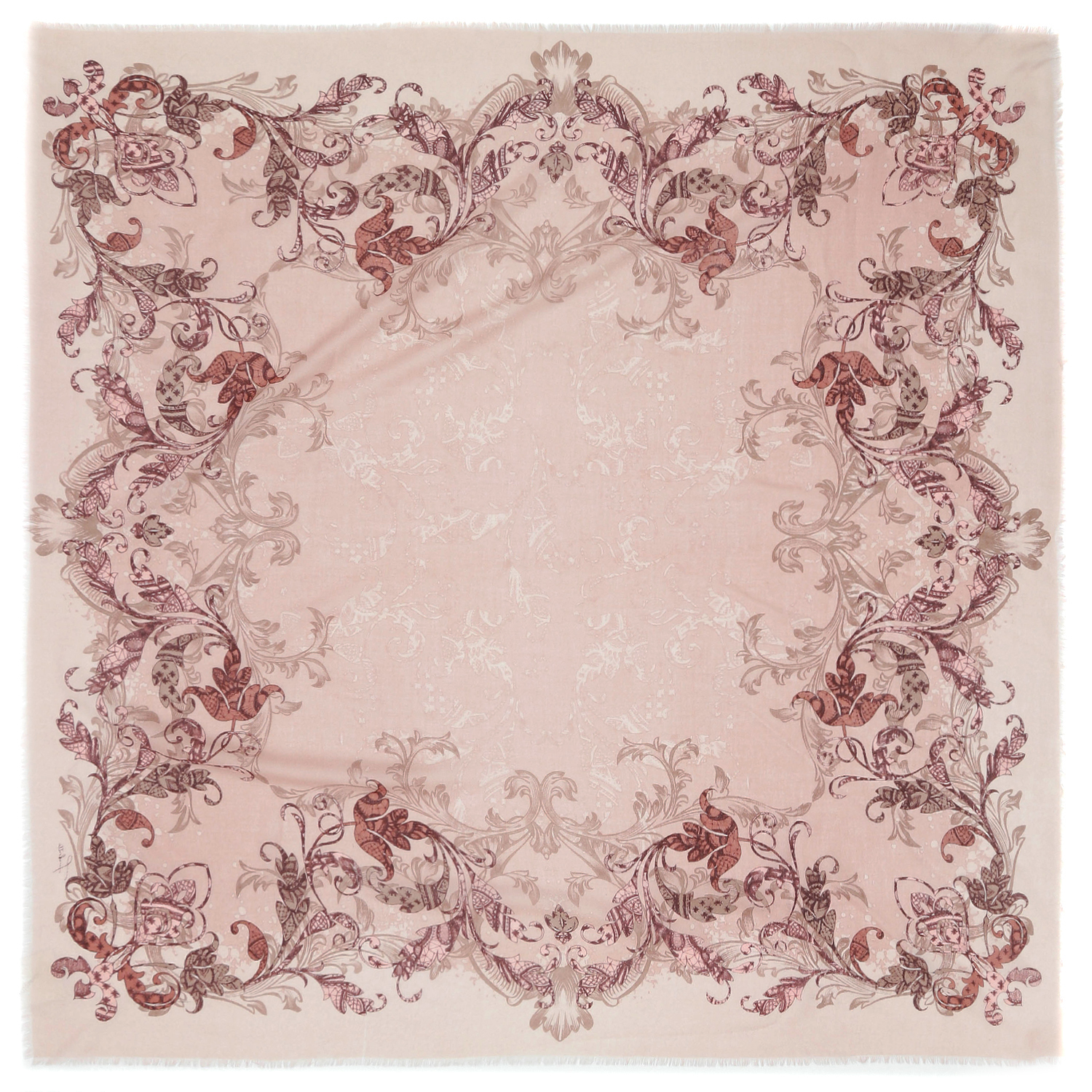 Стильный платок FABRETTI в бежево-розовой гамме обладает приятной фактурой. В дизайне гармонично сочетаются роскошь вензелей в стиле барокко и изящный цветочный орнамент. Аксессуар выполнен из мерсеризованной шерсти. Благодаря специальной обработке натуральная шерсть становится мягкой, шелковистой и приобретает восхитительный блеск. Изделие почти не мнется, не пилингуется и не блекнет, поэтому надолго сохранит первоначальный вид. Края украшены мелкими ресничками. Размер 120*120 см.