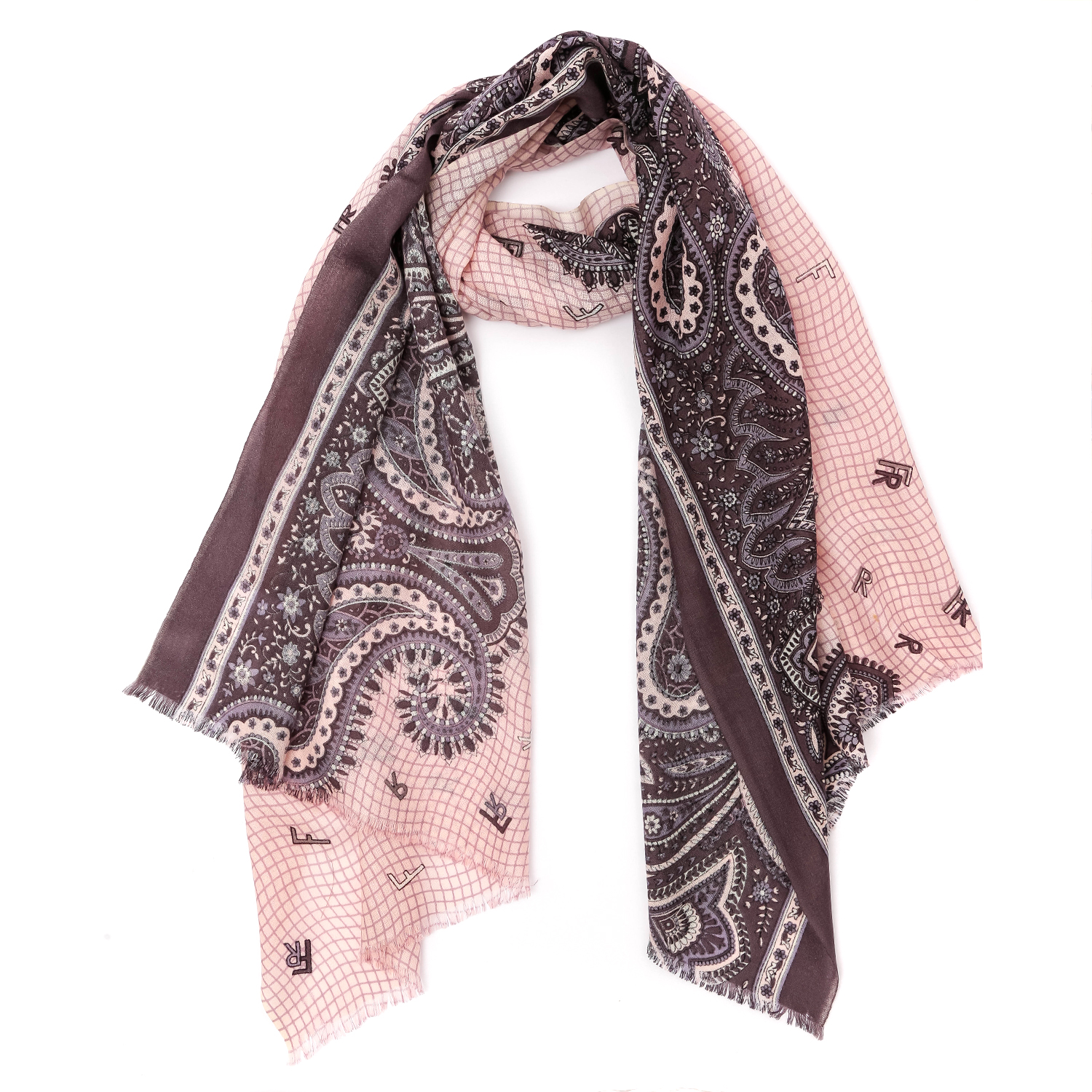Женский шарф FABRETTI в розовом оттенке обладает приятной фактурой и декорирован узором, в котором сочетаются «пейсли» и «логомания». Аксессуар выполнен из мерсеризованной шерсти. Благодаря специальной обработке натуральная шерсть становится мягкой, шелковистой и приобретает восхитительный блеск. Изделие почти не мнется, не пилингуется и не блекнет, поэтому надолго сохранит первоначальный вид. Края украшены мелкими ресничками. Размер 70*180 см.