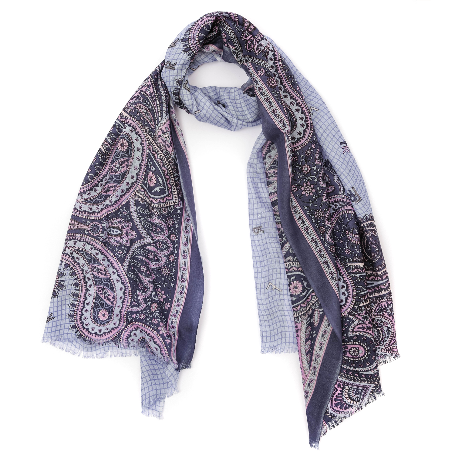 Женский шарф FABRETTI в голубом оттенке обладает приятной фактурой и декорирован узором, в котором сочетаются «пейсли» и «логомания». Аксессуар выполнен из мерсеризованной шерсти. Благодаря специальной обработке натуральная шерсть становится мягкой, шелковистой и приобретает восхитительный блеск. Изделие почти не мнется, не пилингуется и не блекнет, поэтому надолго сохранит первоначальный вид. Края украшены мелкими ресничками. Размер 70*180 см.