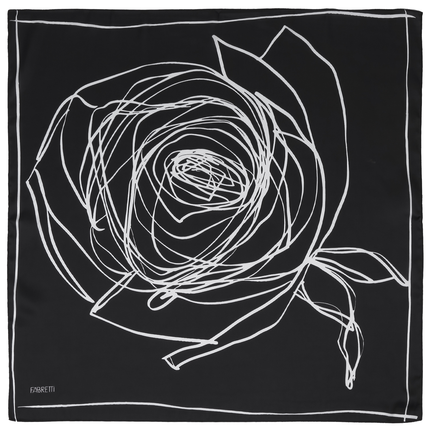 Черный цвет платка служит идеальным фоном для графичного изображения розы, выполненного белыми линиями. В нижнем левом углу платка расположен логотип бренда Fabretti, подтверждающий высокое качество и оригинальность изделия. Его можно носить различными способами: повязать на шею, голову, сумку или использовать в качестве декоративного элемента на одежде. Такой аксессуар добавит нотку романтики и индивидуальности вашему образу. Гладкая, струящаяся текстура ткани дарит ощущение комфорта. Размер 70*70, вес 39г.