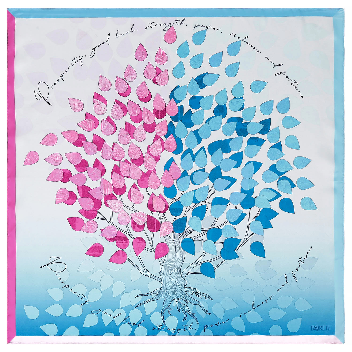Центральный элемент платка Fabretti - стилизованное древо, чьи ветви усыпаны каплевидными листьями, символизирующими богатство, удачу и процветание.  Вокруг древа написана вдохновляющая фраза, подчеркивающая его символическое значение.  Эта надпись выполнена элегантным шрифтом и гармонично вписывается в общий дизайн. Ткань приятная к коже. Аксессуар идеально подойдет как для повседневной носки, так и для особых случаев. Размер 70*70, вес 39г.