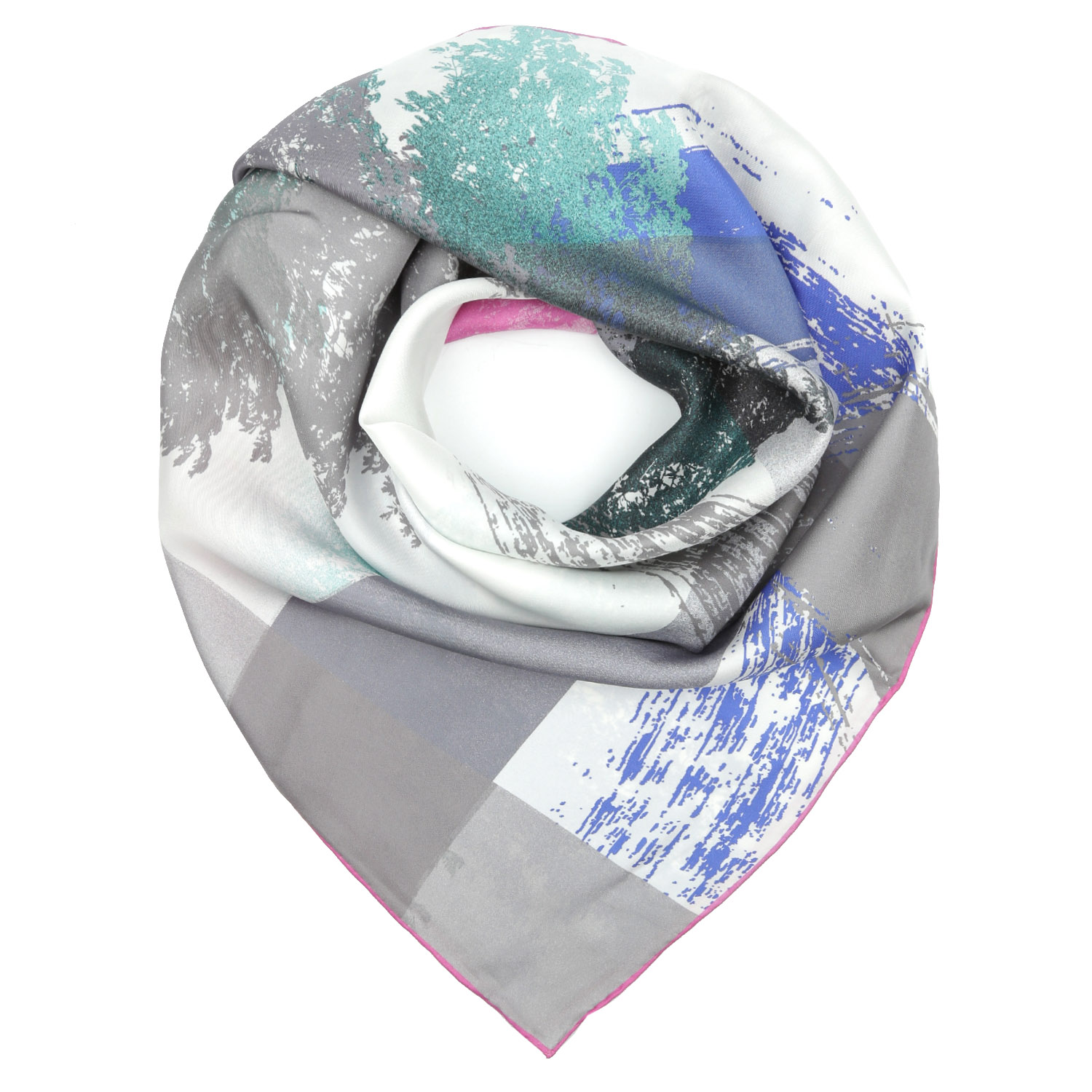 Необычный шелковый платок итальянского бренда FABRETTI, украшенный принтом с силуэтами деревьев и мазками кисти, оформленный в серых, розовых и синих тонах.