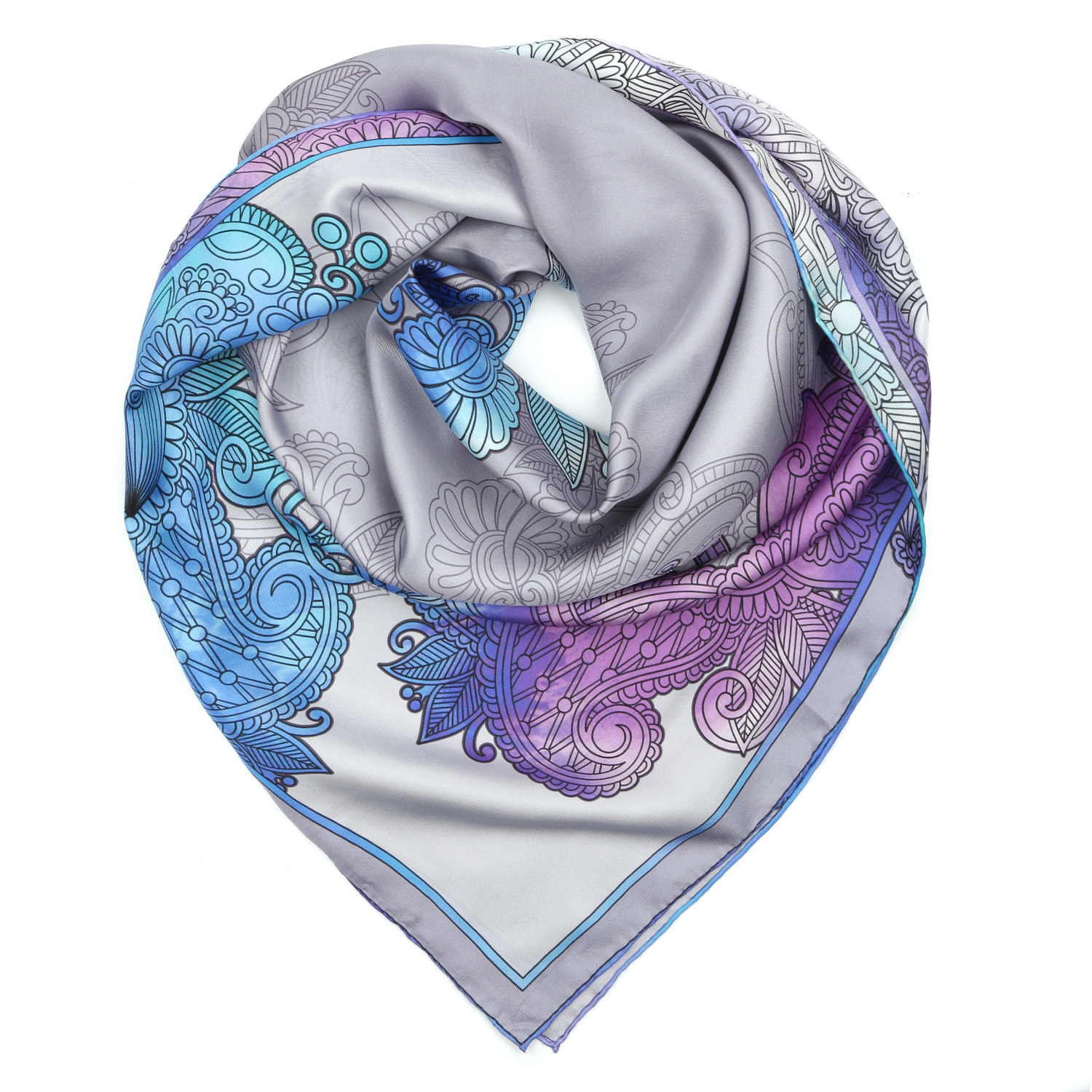 Яркий шелковый платок итальянского бренда FABRETTI, украшенный стилизованными восточными узорами и пейсли в серых, голубых и фиолетовых тонах.