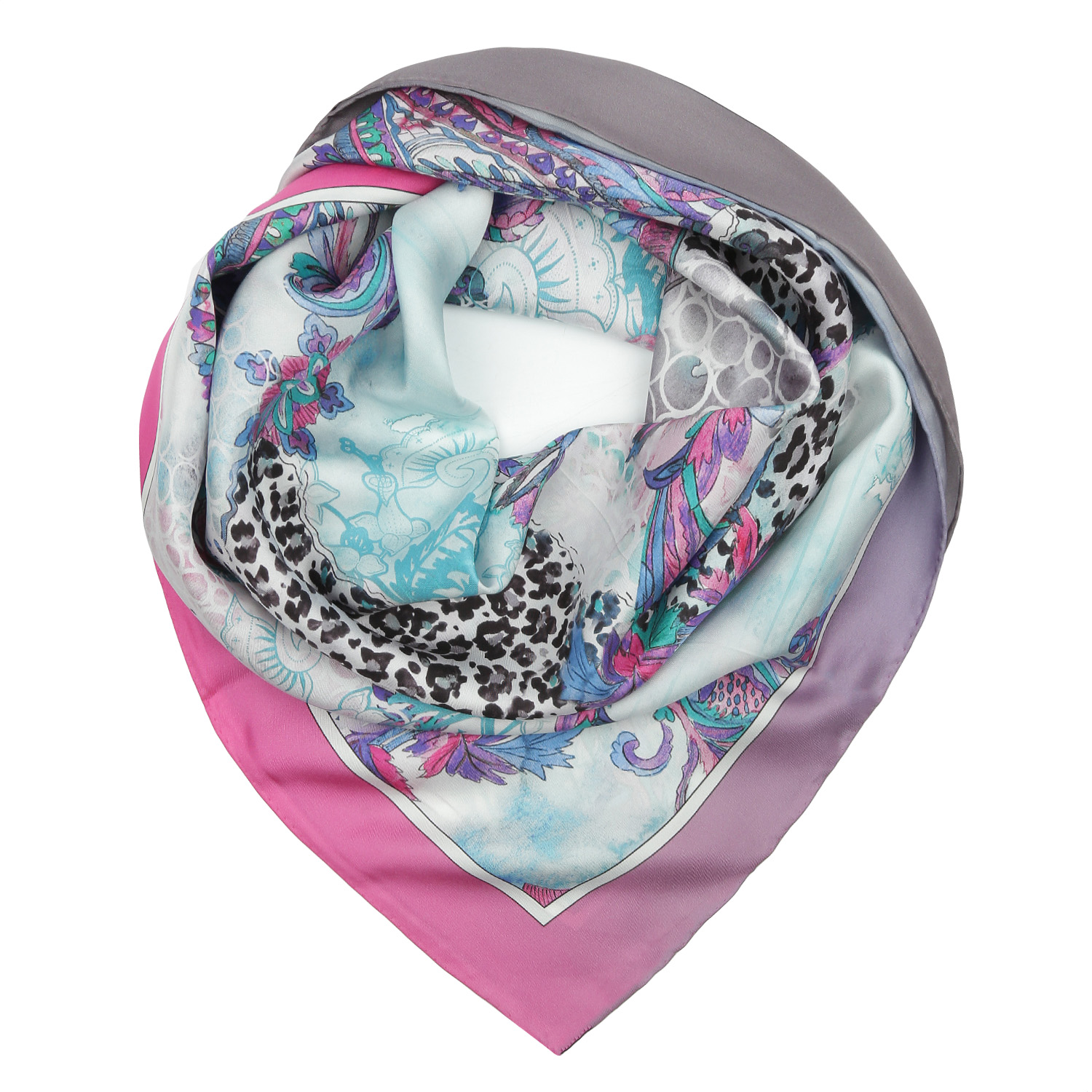 Платок украшен сложным узором, сочетающим восточные мотивы и пейсли, классический леопардовый принт, горох, акварельные разводы и другие элементы. Сложный многослойный принт соответствует актуальной моде на смелые комбинации стилей. Благодаря разнообразию элементов платок сочетается с однотонной одеждой разных цветовых гамм.