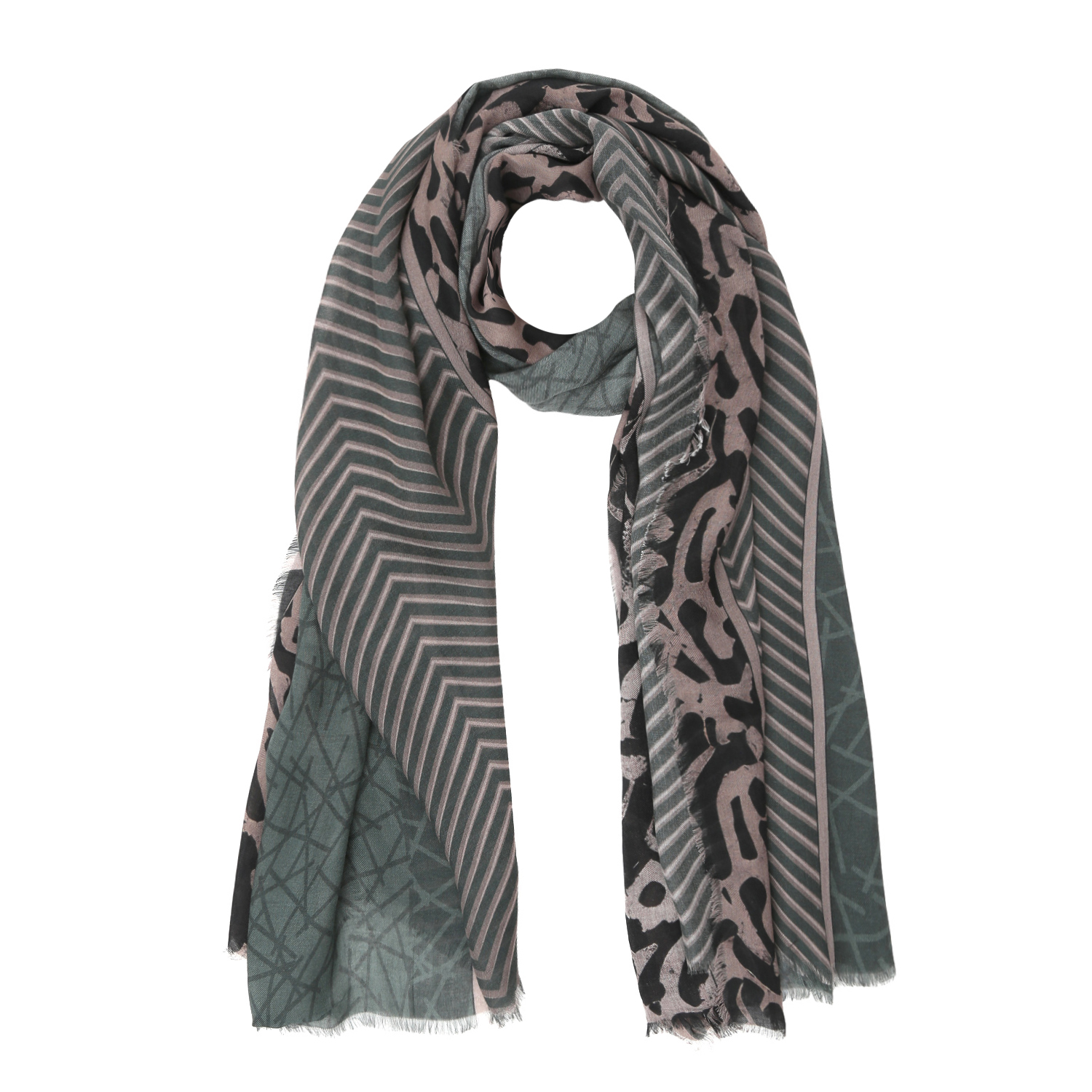 Стильный женский шарф итальянского бренда FABRETTI в оттенках серо-зеленой гаммы обладает легкой шелковистой фактурой с благородным матовым блеском.
