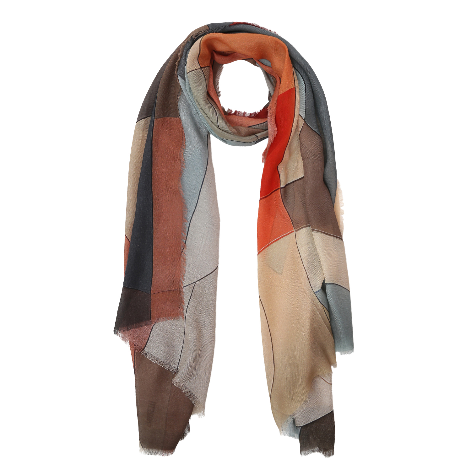 Стильный женский шарф итальянского бренда FABRETTI в ярком  сочетании бежевых, красных, голубых, коричневых оттенков обладает легкой шелковистой фактурой с благородным матовым блеском.