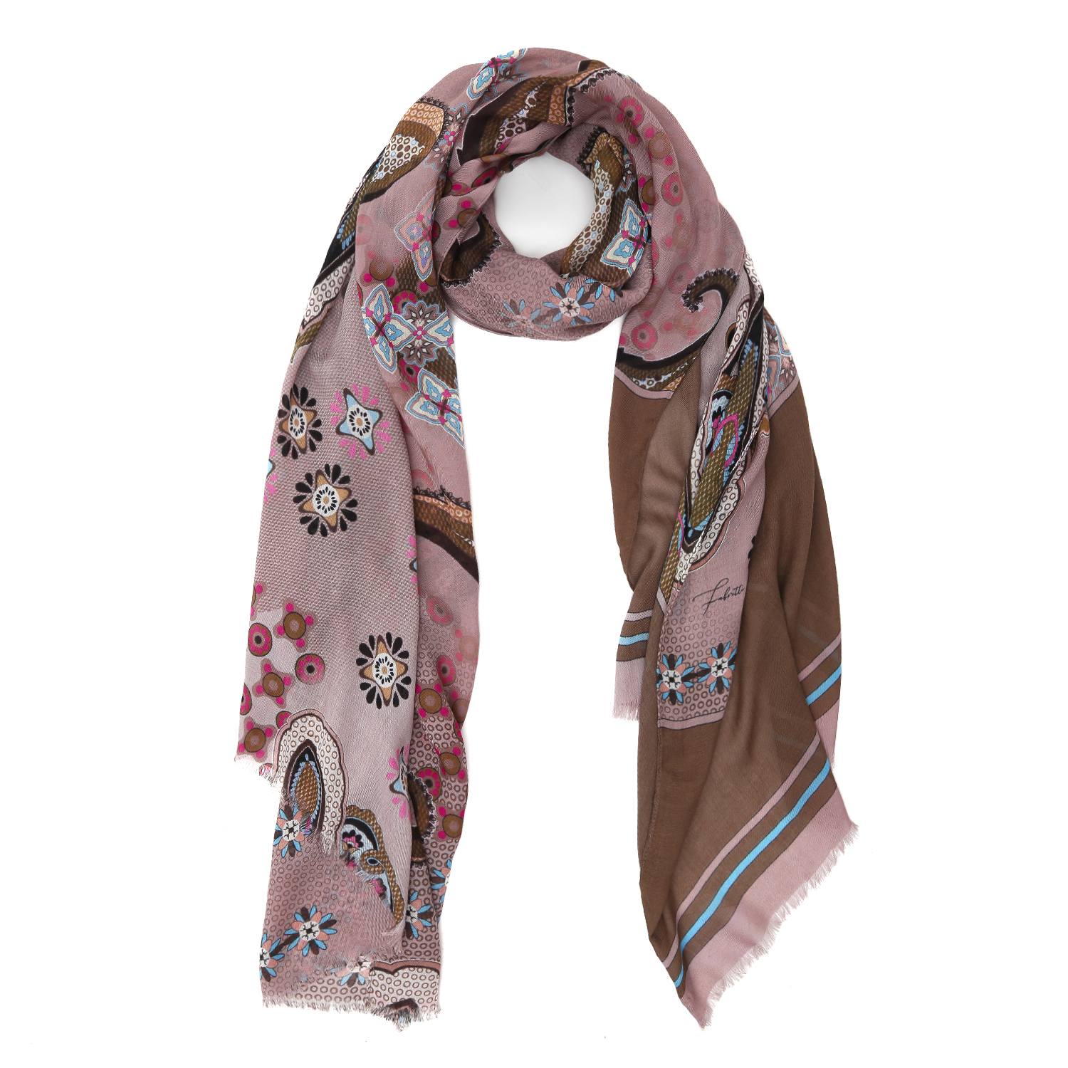 Элегантный женский шарф итальянского бренда FABRETTI в розовых и бежевых тонах с восточным узором «пейсли» и растительными орнаментами.