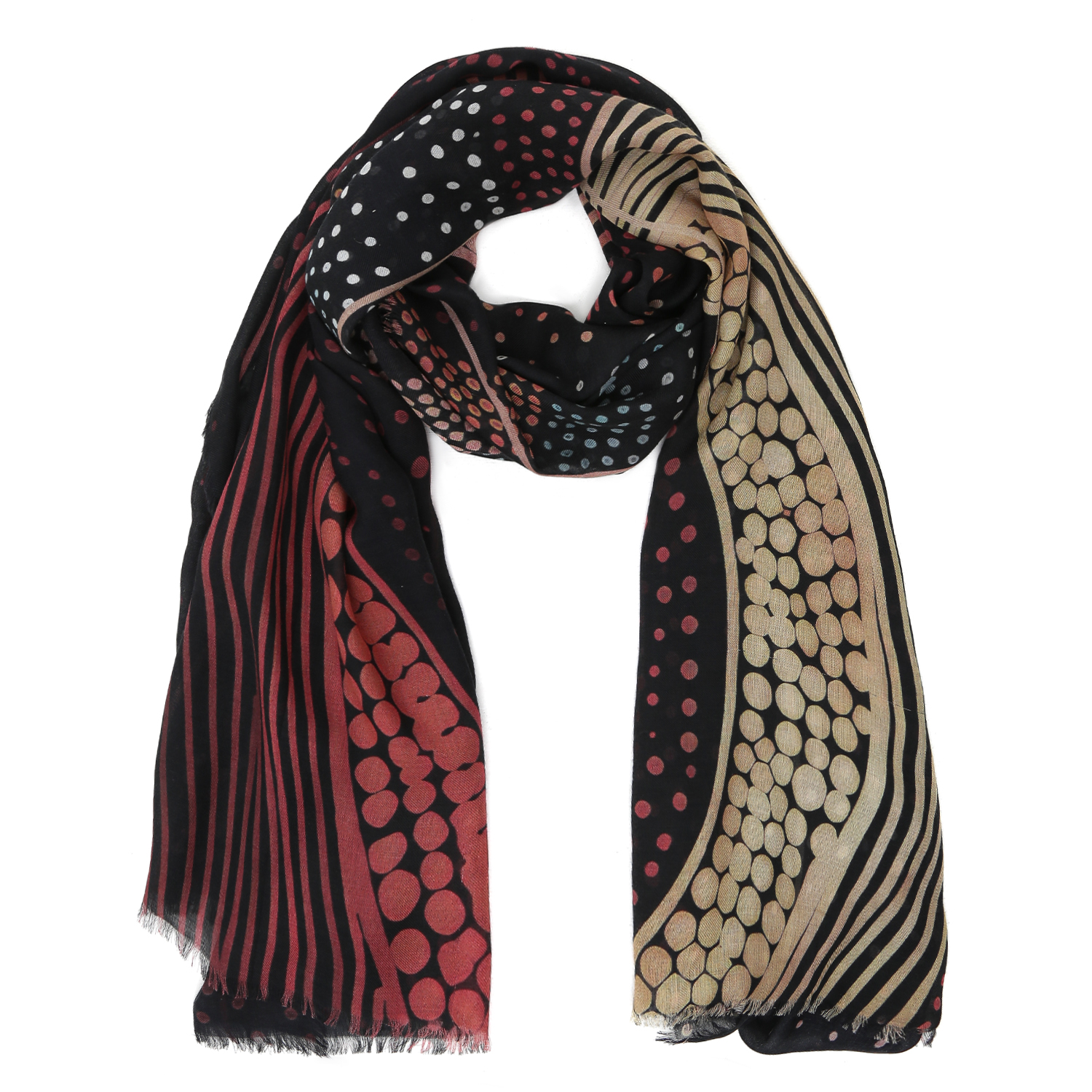 Великолепный женский шарф итальянского бренда FABRETTI с оригинальным абстрактным принтом из гороха и линий в натуральных оттенках красного, оранжевого, желтого на черном фоне обладает легкой шелковистой фактурой с благородным матовым блеском.