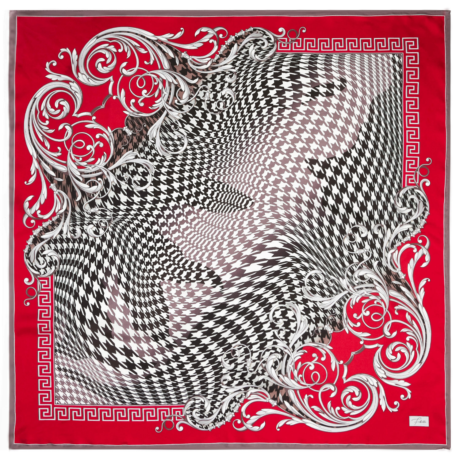 Стильный платок FABRETTI из шелкового твила в бордовом оттенке станет заметной деталью в образе. Аксессуар легко драпируется и практически не мнется. Не скользит, что позволяет ему прекрасно держать узел. Модель украшена дизайнерским принтом, в котором сочетаются роскошь барочных вензелей и тайна оптических иллюзий. Высокую четкость деталей и тонкую цветопередачу удалось получить с помощью сложной техники цифровой печати. Изделие можно носить на шее или повязать на ручку любимой сумки, освежив ее внешний вид. Края обработаны вручную. Размер 90*90 см. Плотность - 12 момми.