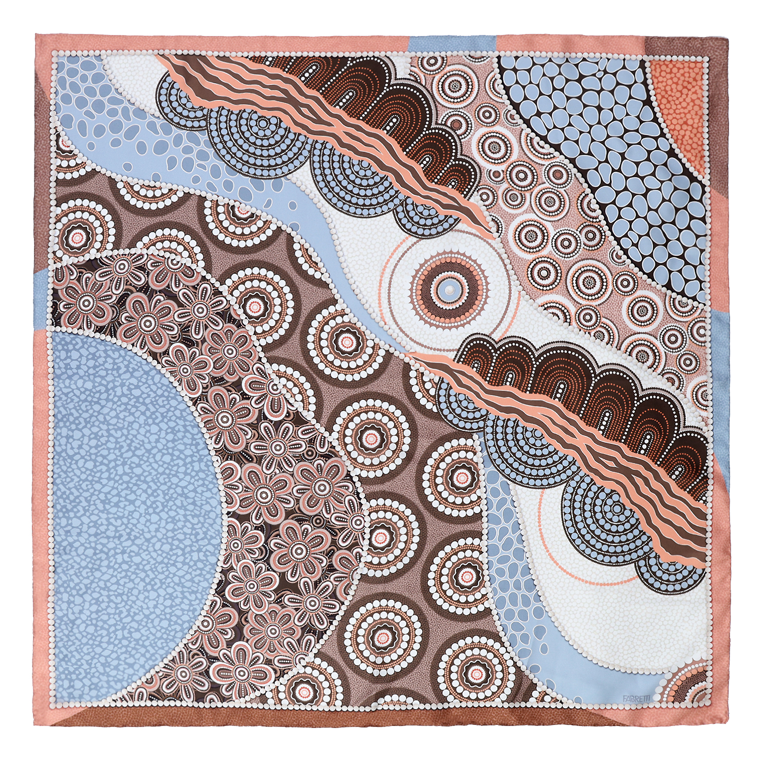 Классический женский платок итальянского бренда FABRETTI из натурального шелка с интересным абстрактным узором, сложенным из горошин разного размера, цвета и формы в нежных коралловых и голубых тонах.