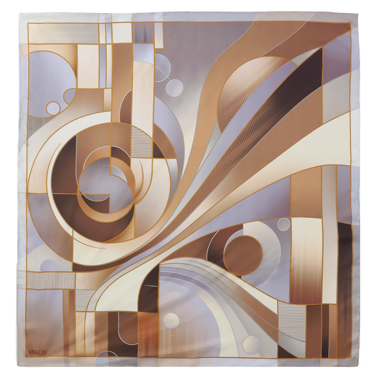 Великолепный женский платок итальянского бренда FABRETTI из натурального шелка с абстрактным геометрическим узором.  Платок смотрится эффектно и элегантно благодаря плавным линиям и градиентным переходам оттенков насыщенной коричневой и бежевой гаммы.