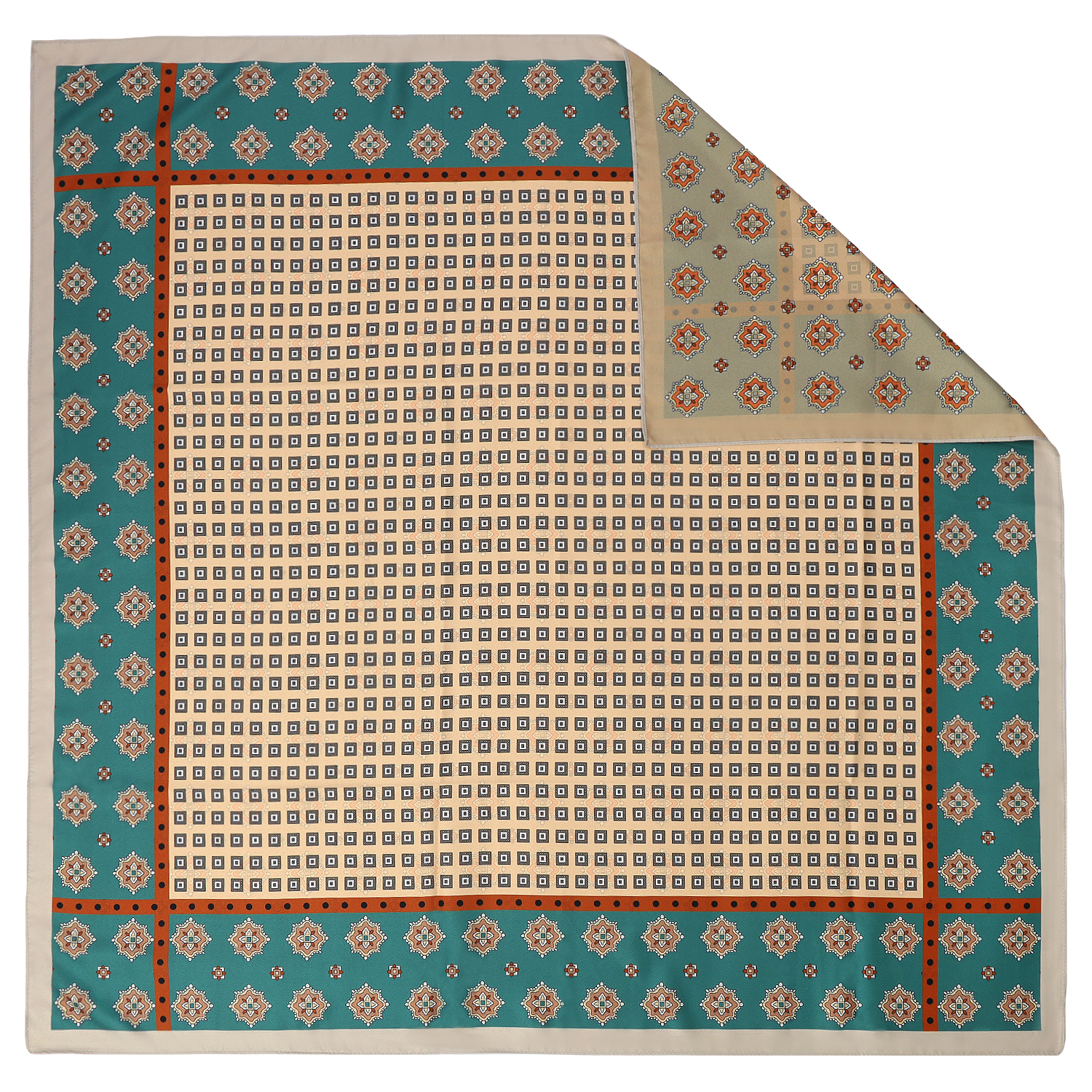 Роскошный двусторонний женский платок итальянского бренда FABRETTI из искусственного шелка украшен с одной стороны сочетанием восточных цветочных орнаментов и геометрических форм, с другой – сплошным узором из стилизованных восточных цветов.