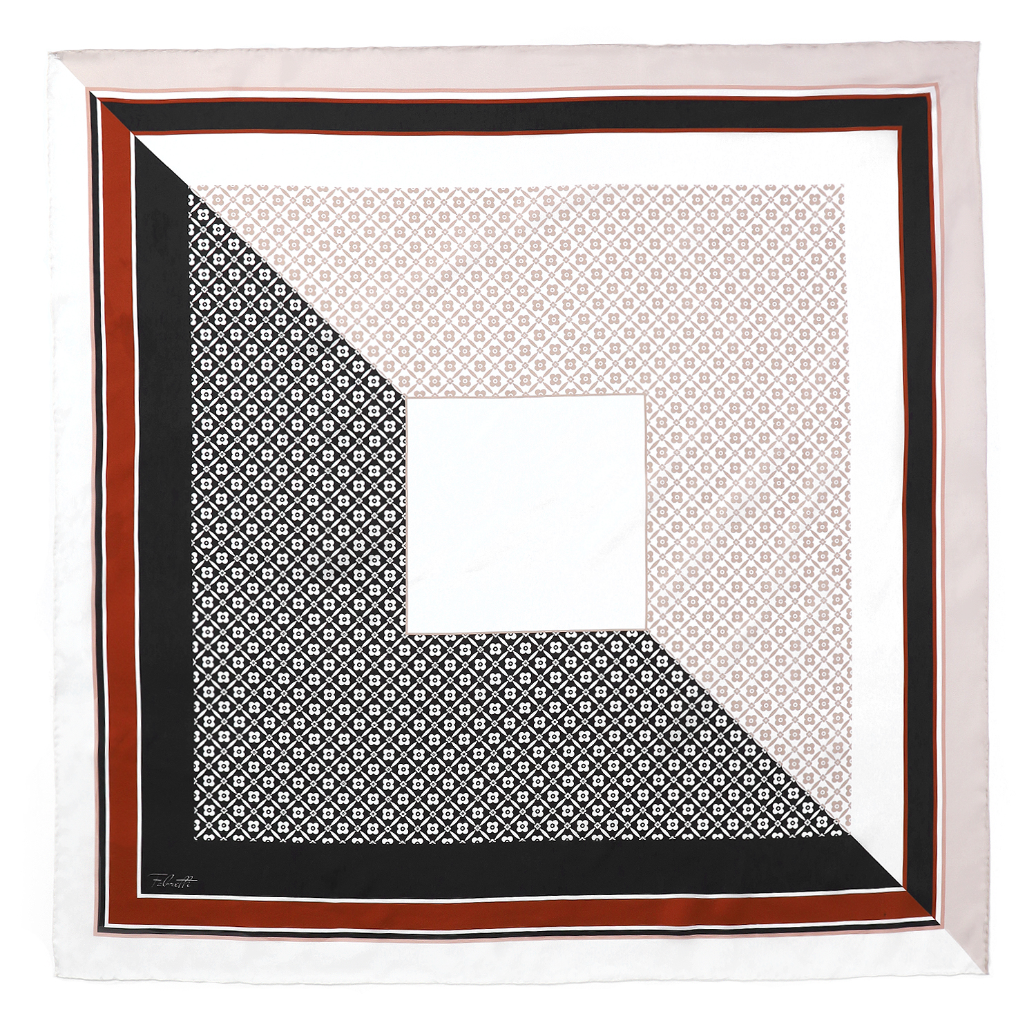 Классический женский платок итальянского бренда FABRETTI из натурального шелка с геометрическим узором и орнаментом из стилизованных цветов сочетает светло-бежевый, рыже-коричневый и черный оттенки.