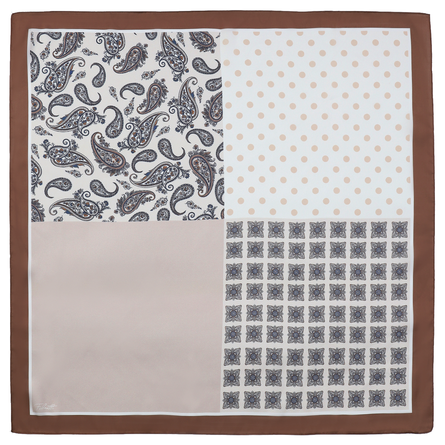 Оригинальный женский платок итальянского бренда FABRETTI из искусственного шелка в коричневых тонах визуально разбит на 4 сегмента с различным декором. Он украшен такими элементами как классические узоры «пейсли» и горох, сложным восточным орнаментом, один сегмент однотонный. Это стилистическое решение позволяет носить один аксессуар в разных стилях и сочетать с различной одеждой и аксессуарами – от офисной до бохо.