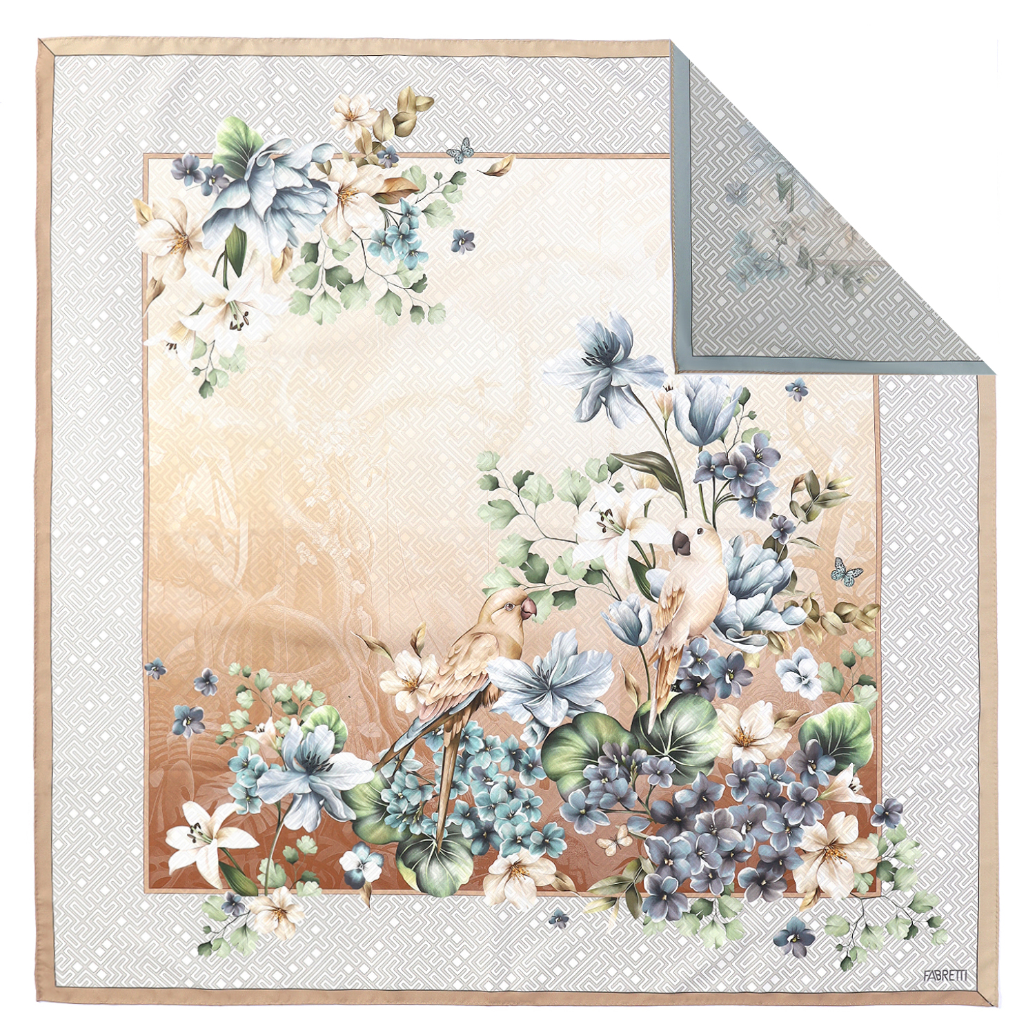 Элегантный женский платок итальянского бренда FABRETTI из искусственного шелка оригинально сочетает романтичные растительные узоры с четким геометрическим орнаментом. Изнаночная сторона украшена лабиринтом из геометрических форм.