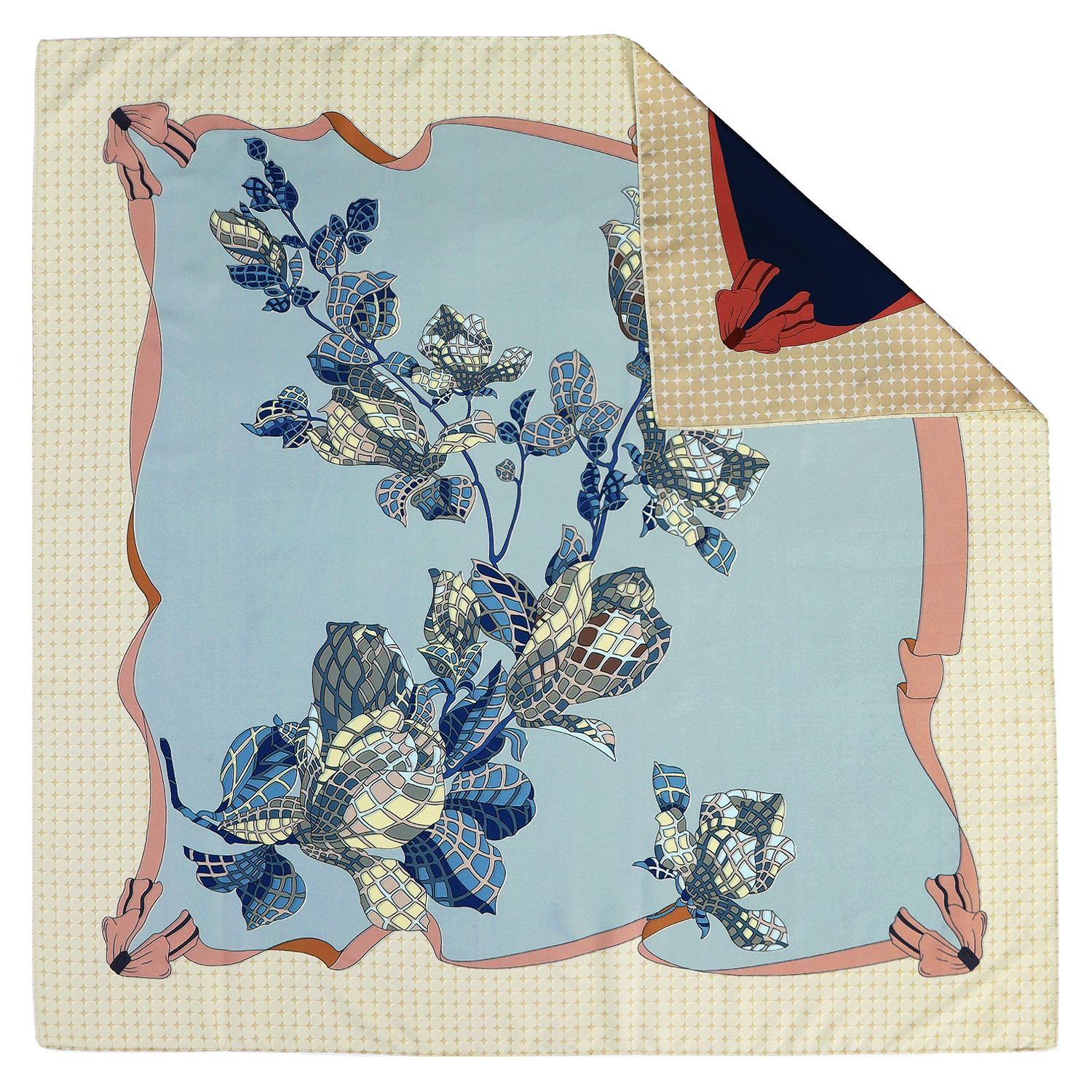 Элегантный и необычный двусторонний  женский платок итальянского бренда FABRETTI из искусственного шелка, украшенный стилизованным принтом в виде ветки цветущей магнолии, сложенной из геометрических фигур. Одна сторона платка в нежных голубых тонах, вторая – насыщенно-синяя, поэтому он отлично сочетается и со светлым, и с темным гардеробом, выступая в качестве основного акцента или легкого дополнения к образу.
