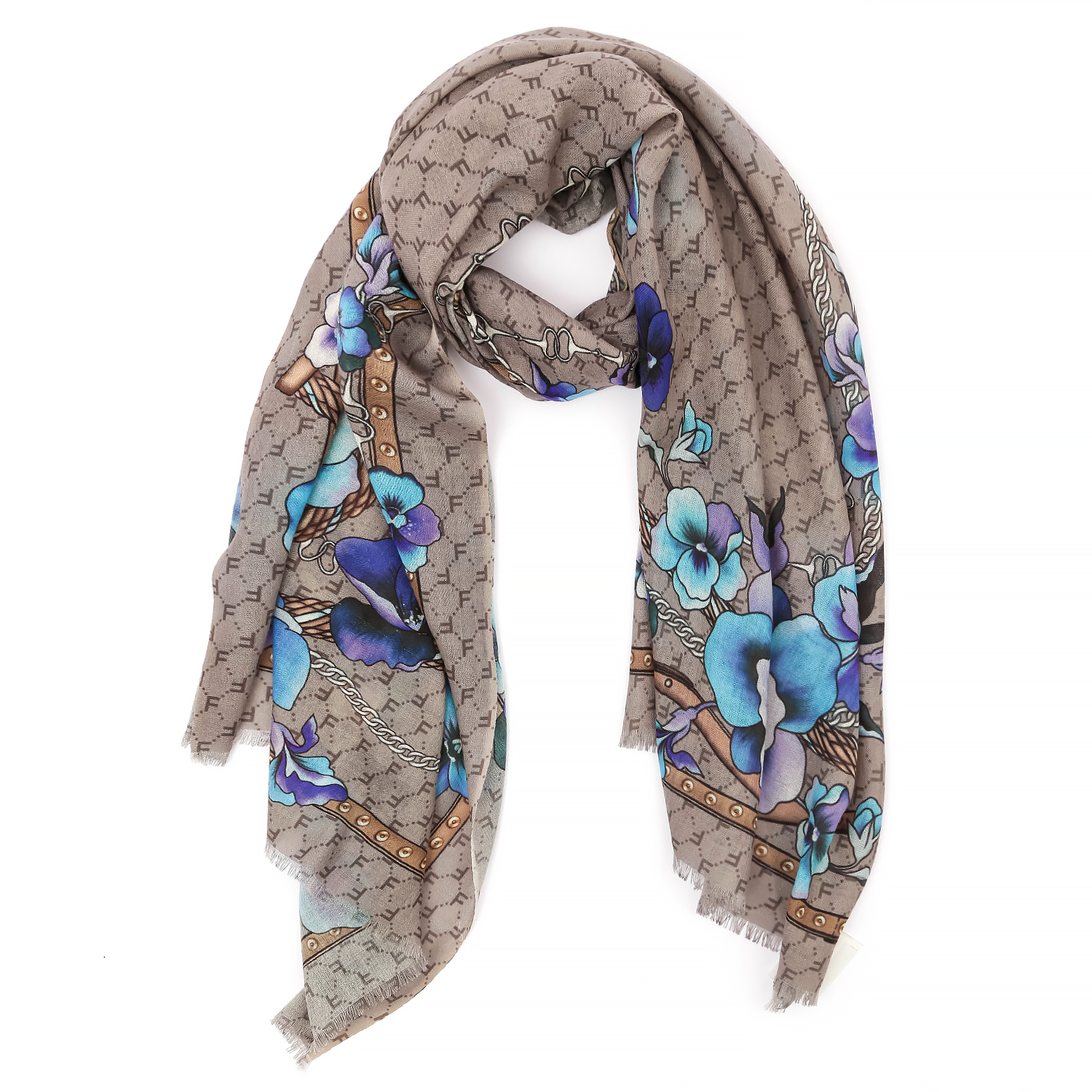 Женский шарф FABRETTI в сером оттенке с синими акцентами обладает приятной фактурой и декорирован эффектным узором, в котором сочетаются «логомания» и флористический принт. Аксессуар выполнен из мерсеризованной шерсти. Благодаря специальной обработке натуральная шерсть становится мягкой, шелковистой и приобретает восхитительный блеск. Изделие почти не мнется, не пилингуется и не блекнет, поэтому надолго сохранит первоначальный вид. Края украшены мелкими ресничками. Размер 70*180 см.