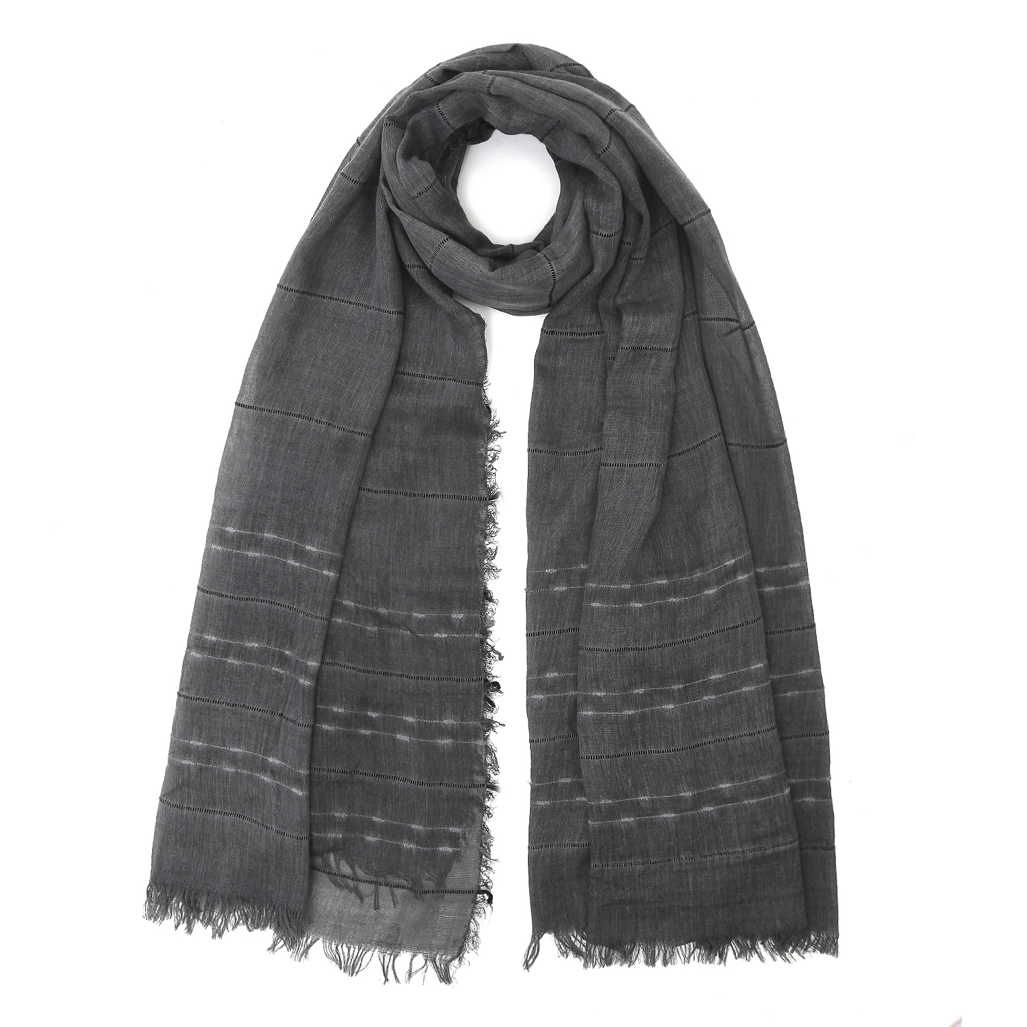 Широкий и объемный легкий мужской шарф итальянского бренда FABRETTI в серых тонах, украшенный горизонтальными полосками. Материал хорошо пропускает воздух, держит форму, устойчива к выцветанию.