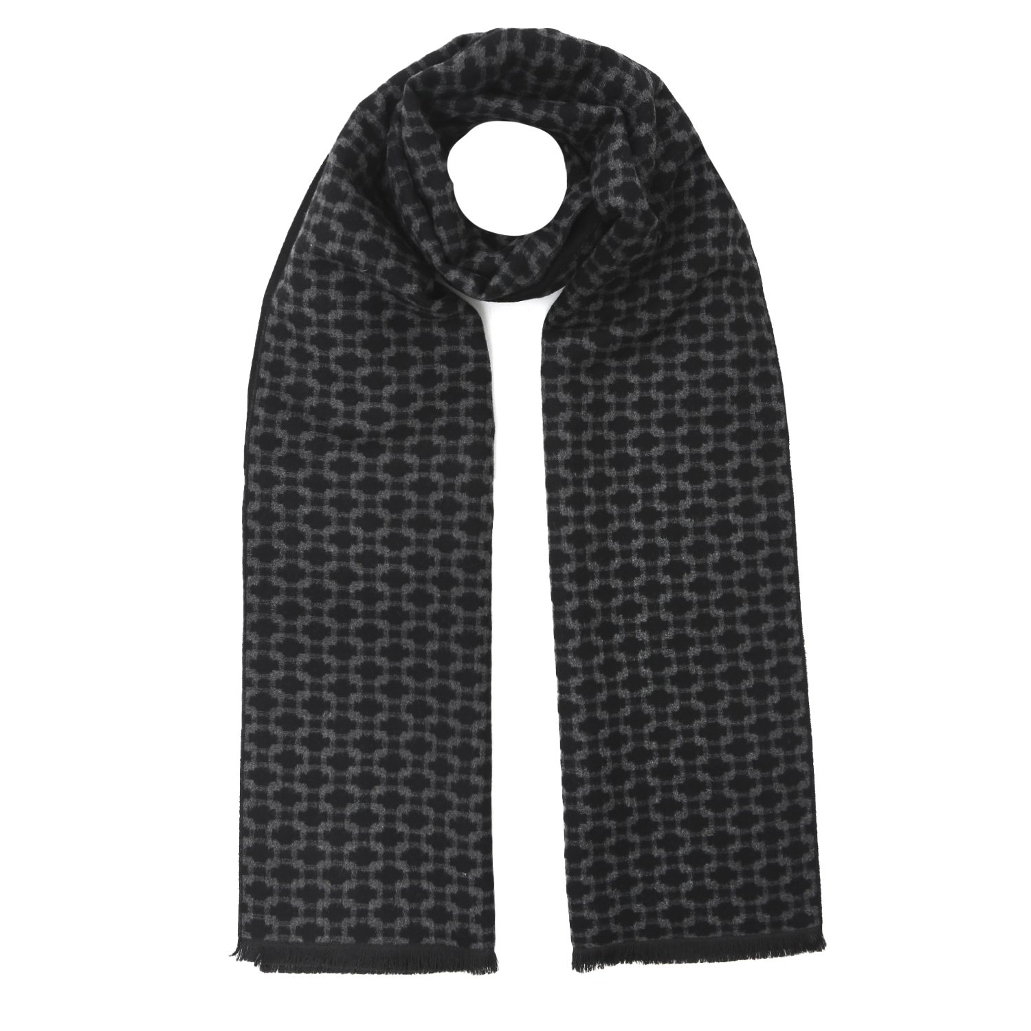 Двусторонний мужской шарф итальянского бренда FABRETTI в сочетании серого и черного тонов украшен с одной стороны сложным геометрическим узором. Вторая сторона однотонная.