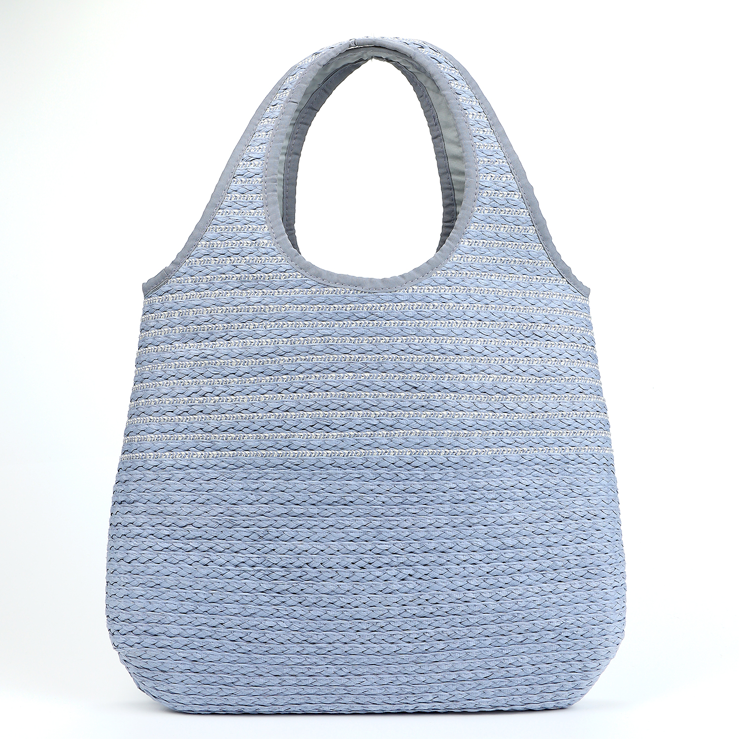 Необычная летняя сумка-пакет из плетеной соломки итальянского бренда FABRETTI в нежно-голубом оттенке с отделкой тонкими бело-голубыми горизонтальными полосками.