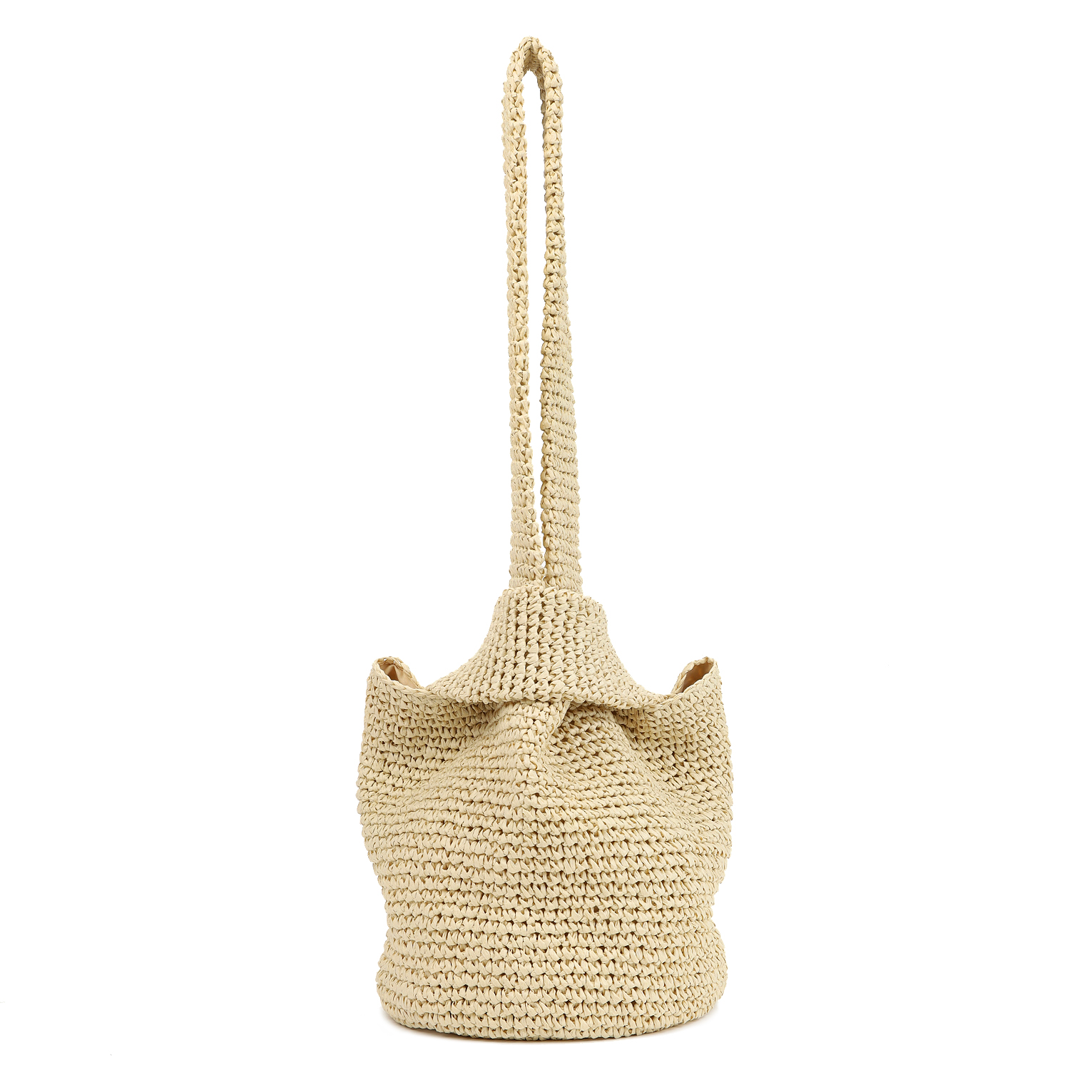У нее круглое дно, внутреннее отделение на подкладке, без карманов, она выполнена в бежевом цвете. Рекомендуемый способ ношения сумки – продеть длинную ручку через короткую и носить сумку на плече.