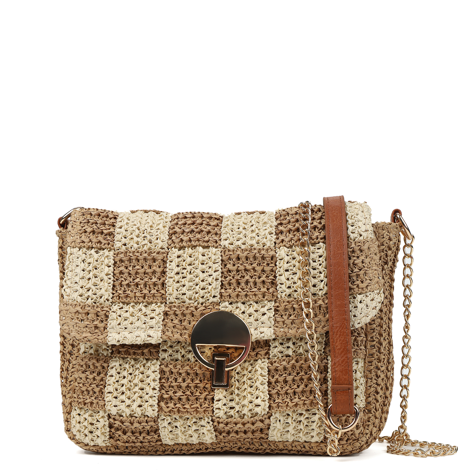 Интересен декор модели: верх выполнен шахматным плетением из светлых и темных квадратов. Сумка дополнена ремешком-цепочкой с вставкой из экокожи на плече.