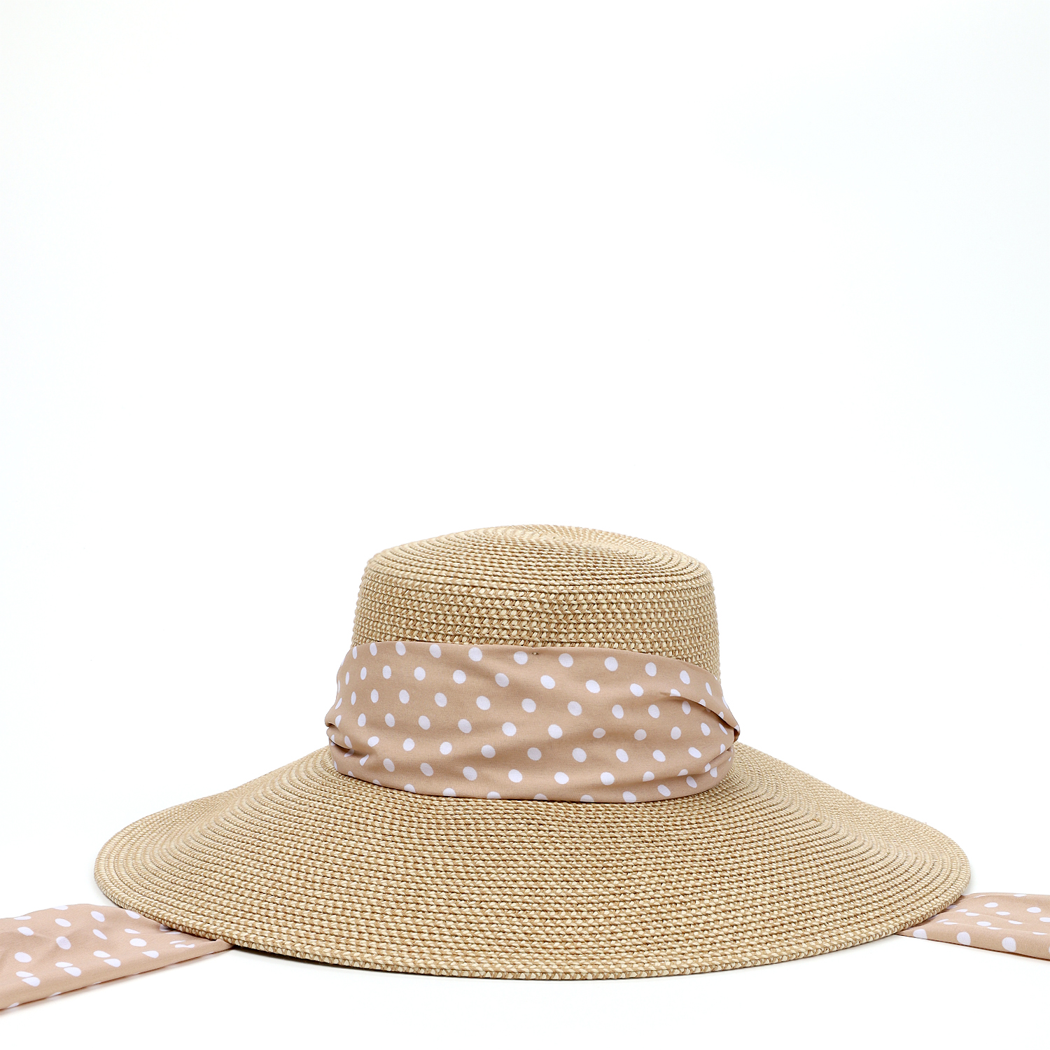 Шляпа украшена широкой и длинной лентой в горошек со свободно спущенными концами.