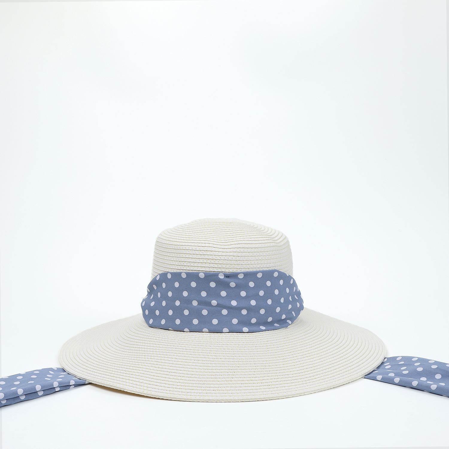 Шляпа украшена широкой и длинной лентой в горошек со свободно спущенными концами.