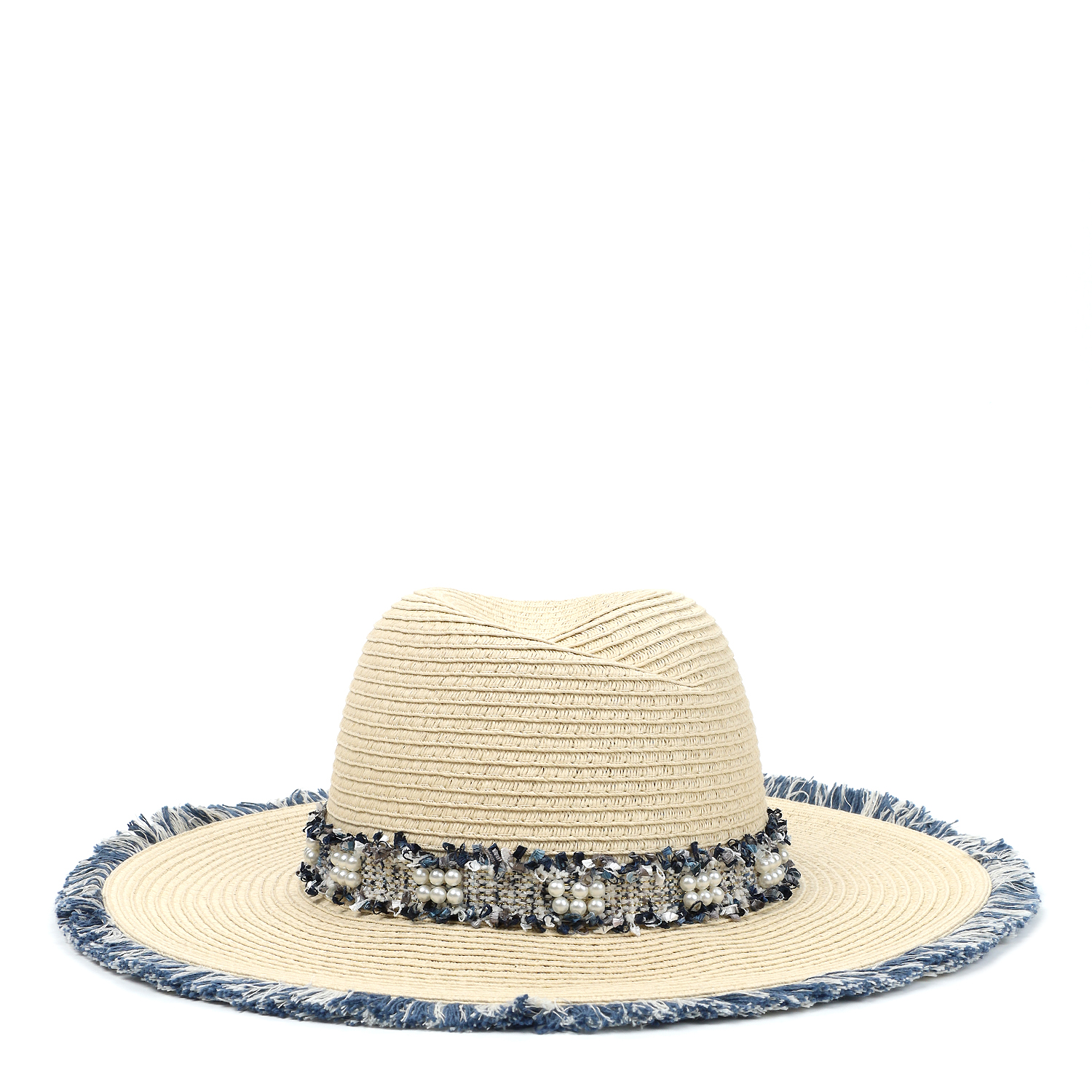 Романтичная женская широкополая шляпа итальянского бренда FABRETTI в бежевом цвете. Стильная, элегантная и практичная модель с необычным декором. Тулья украшена голубой текстильной лентой со сложной отделкой и нашитыми жемчужинами, по краю нашита пушистая бахрома. Внутри объем регулируется лентой. Широкие поля этой шляпы отлично защищают от солнца, а легкий «плетеный» материал хорошо пропускает воздух, не давая перегреться на жаре.