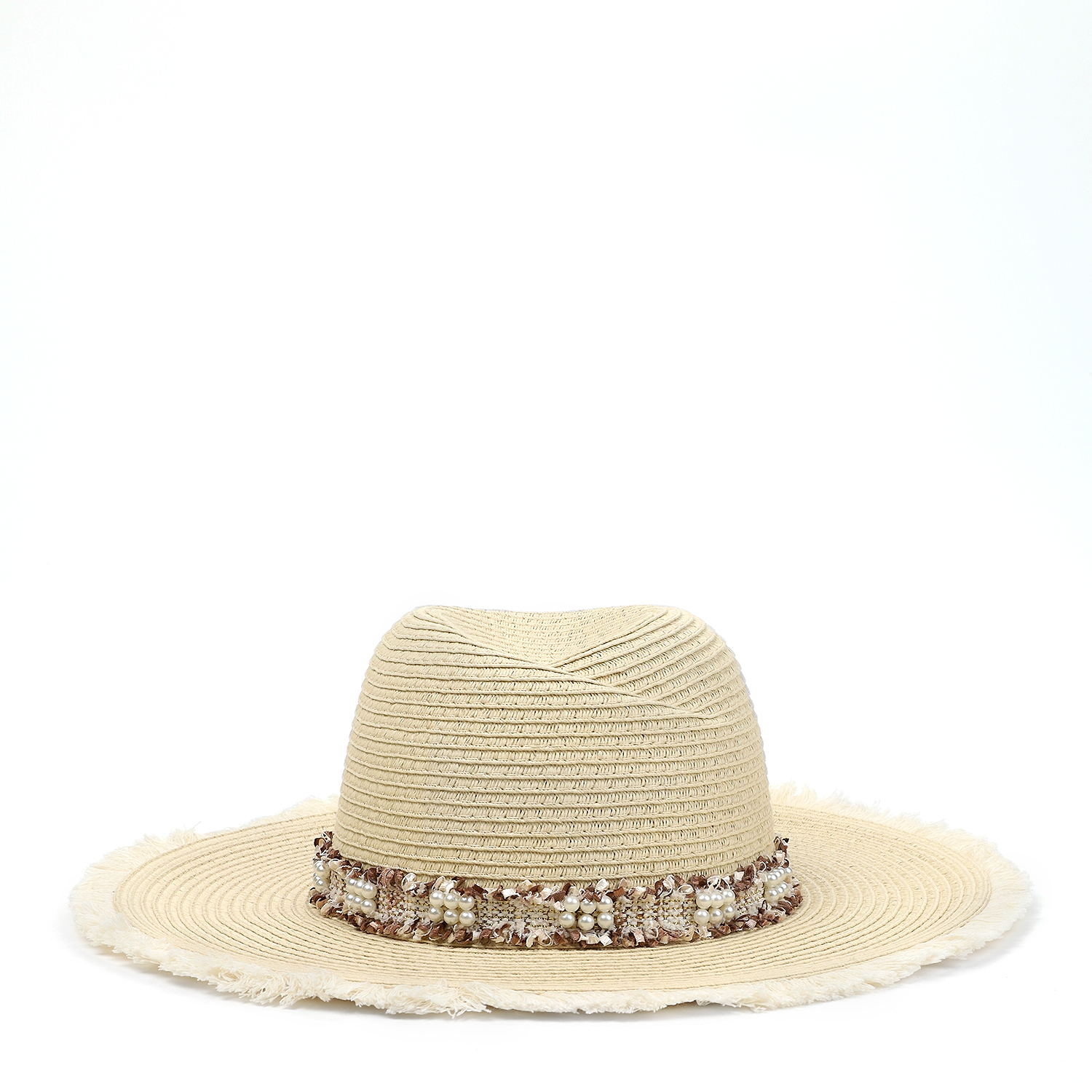 Романтичная женская широкополая шляпа итальянского бренда FABRETTI в бежевом цвете. Стильная, элегантная и практичная модель с необычным декором. Тулья украшена бежевой текстильной лентой со сложной отделкой и нашитыми жемчужинами, по краю нашита пушистая бахрома. Внутри объем регулируется лентой. Широкие поля этой шляпы отлично защищают от солнца, а легкий «плетеный» материал хорошо пропускает воздух, не давая перегреться на жаре.